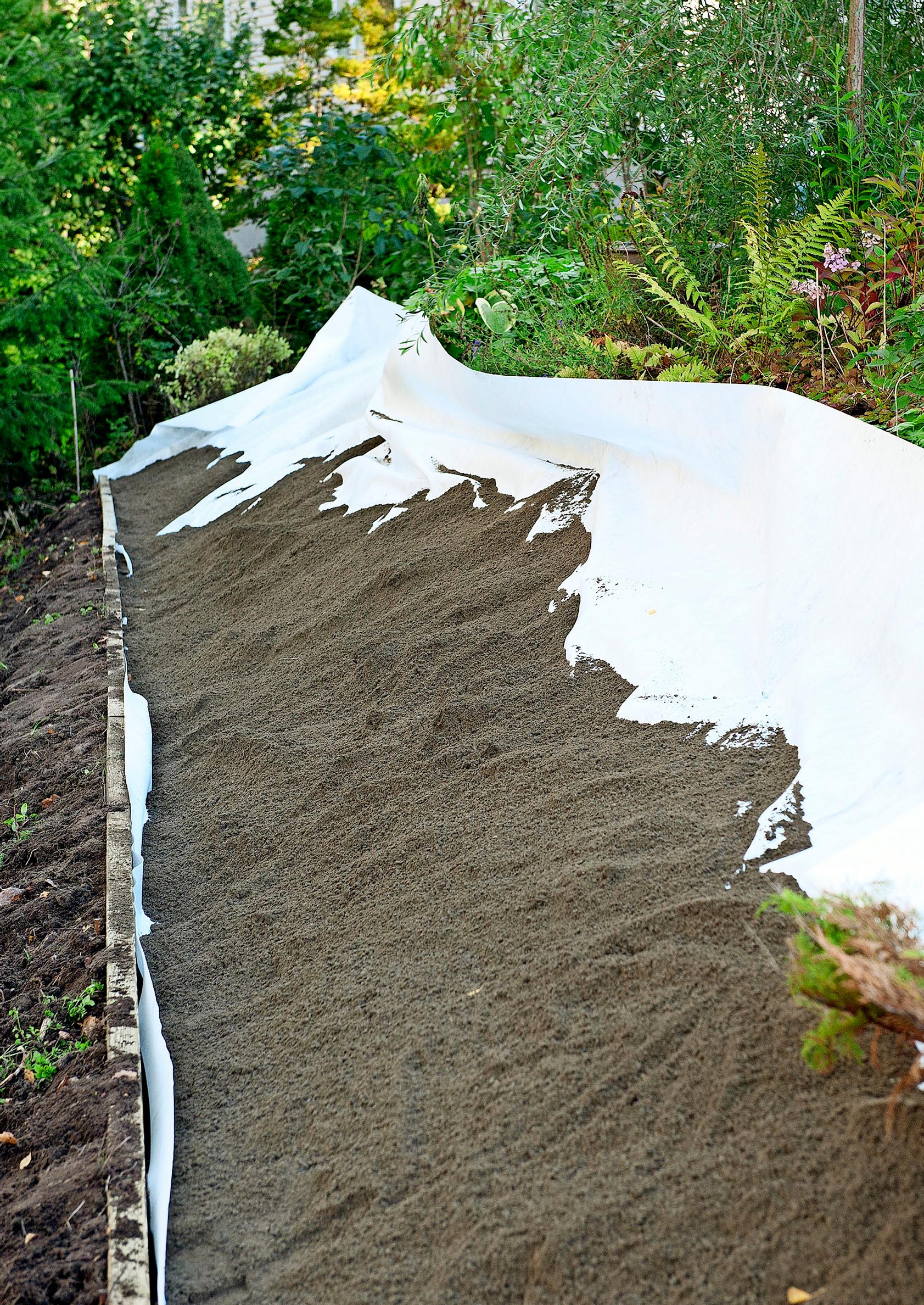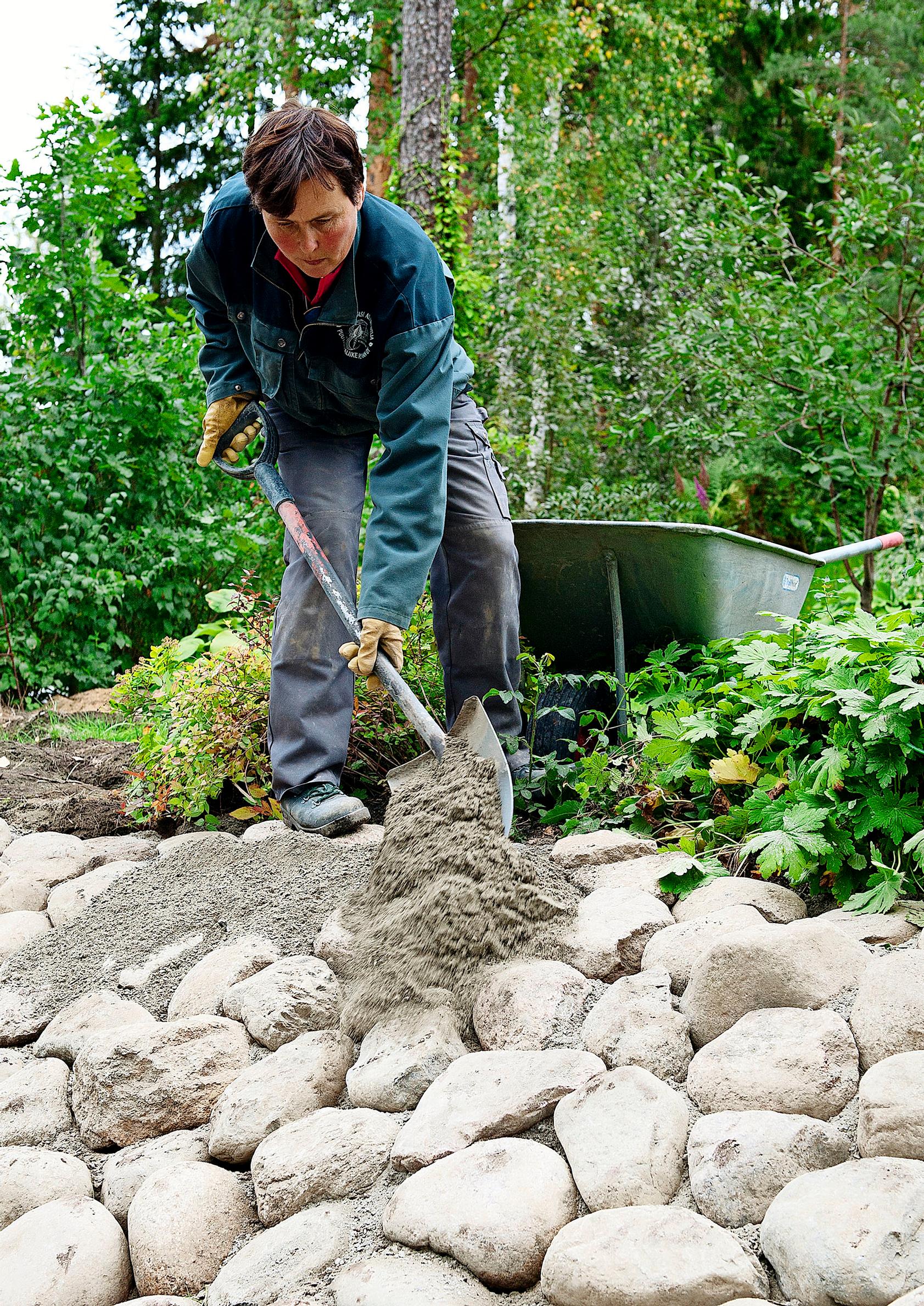 Siirrä kivettävällä alueella kasvavat kasvit toisaalle ja kitke rikkakasvit huolellisesti. Poista myös ylimääräistä maata ja korvaa se kivituhkalla tai soralla. Tasoita ja tiivistä pohja.