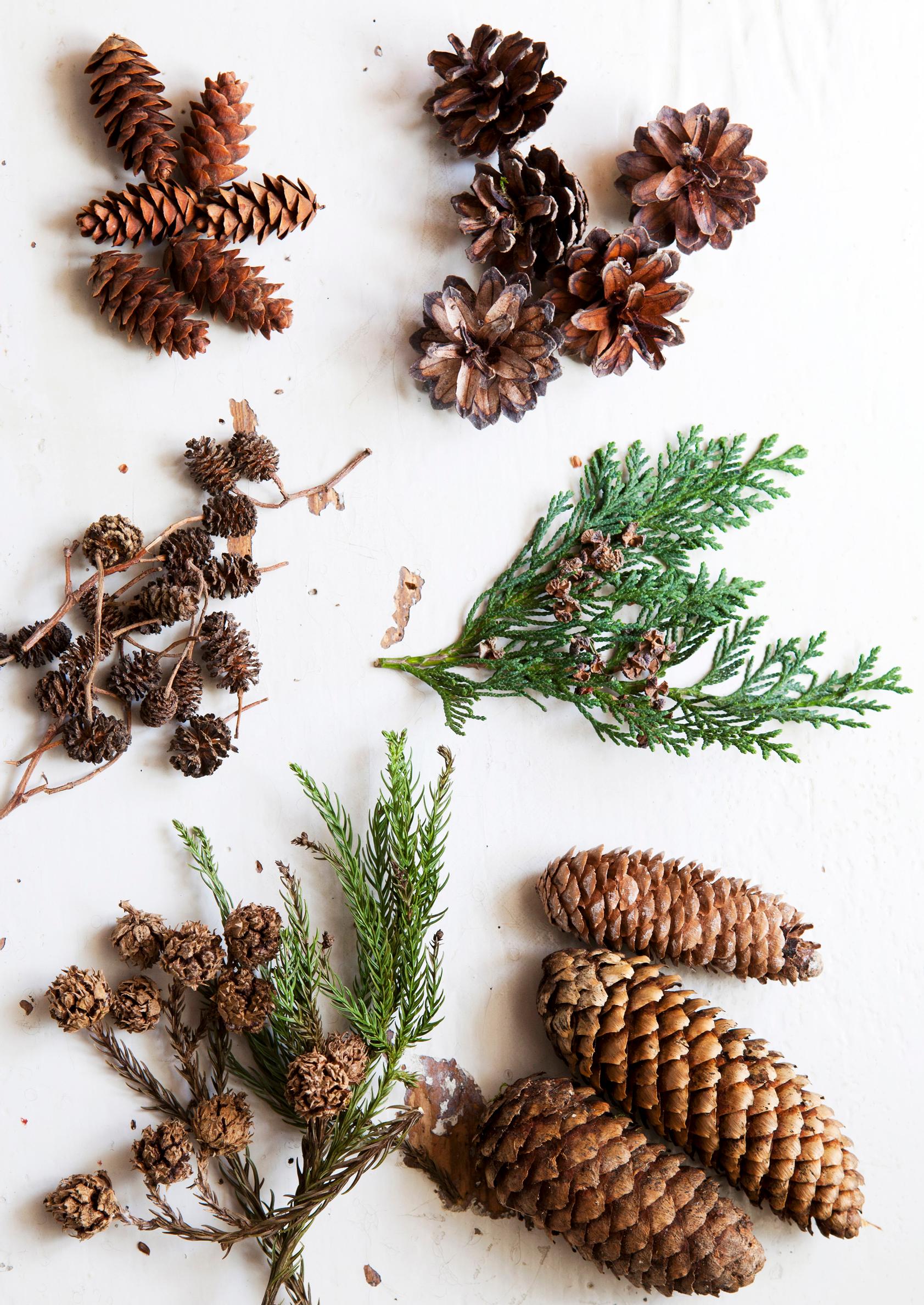 Hyödynnä joulukoristeiden askarteluissa erilaisia käpyjä. Ylimpänä erilaisten kuusilajien käpyjä ja männynkäpyjä. Keskimmäisenä tervalepän norkkoja eli ”käpyjä” sekä tuijan ja sypressin oksia. Alimmalla rivillä sugipuun eli japaninsypressin oksia ja kuusen käpyjä.