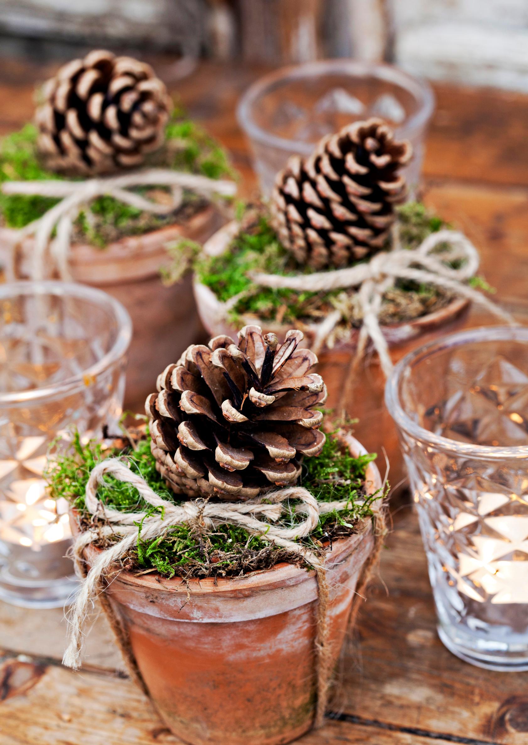 Kotoisan koristelun ainekset ovat maanläheisiä: saviruukkuja, sammalta, somia käpyjä ja rouheaa narua. Sammalen keräykseen tarvitset aina maanomistajan luvan.