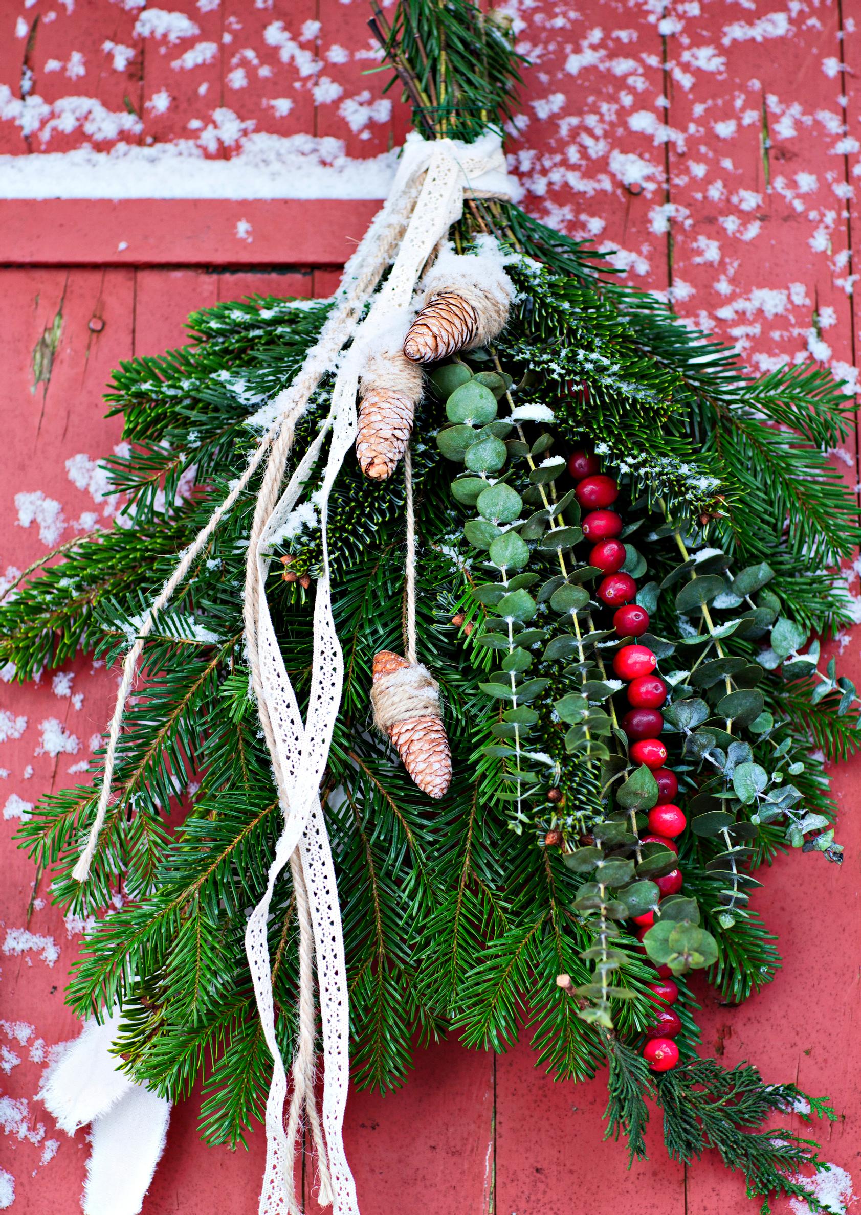 Kranssin sijaan voit ripustaa oveen kimpun havun- ja eukalyptuksenoksista sekä kävyistä, marjoista ja nauhoista. Kuvan ovikimppuun on lisäksi tehty karpaloketju.