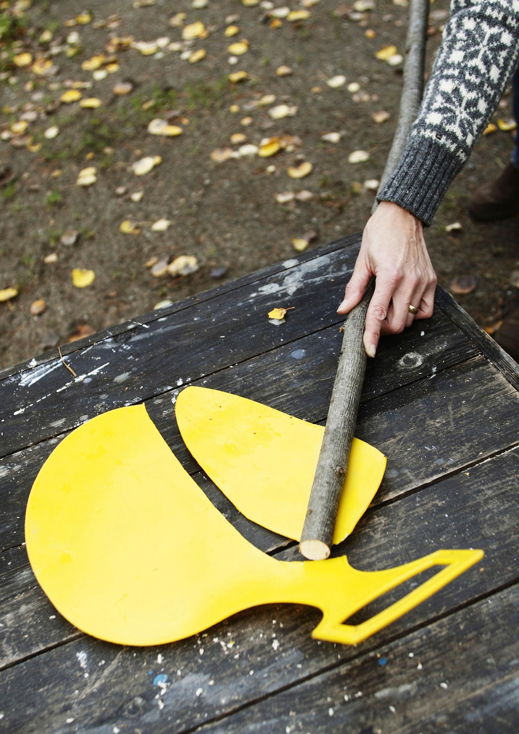 1. Tee sitten apuväline sadevesikourujen puhdistukseen. Tutki kourujen muoto ja leikkaa peltisaksilla esimerkiksi vanhasta lasten liukurista silmämääräisesti kourun pohjan kokoinen ja muotoinen kappale.
