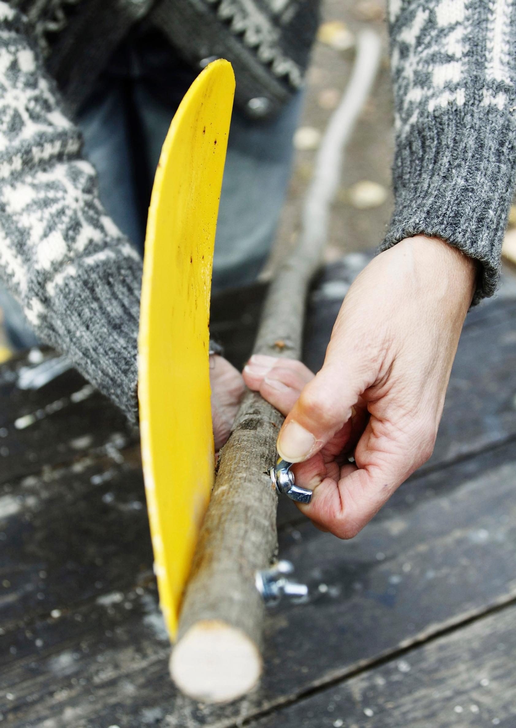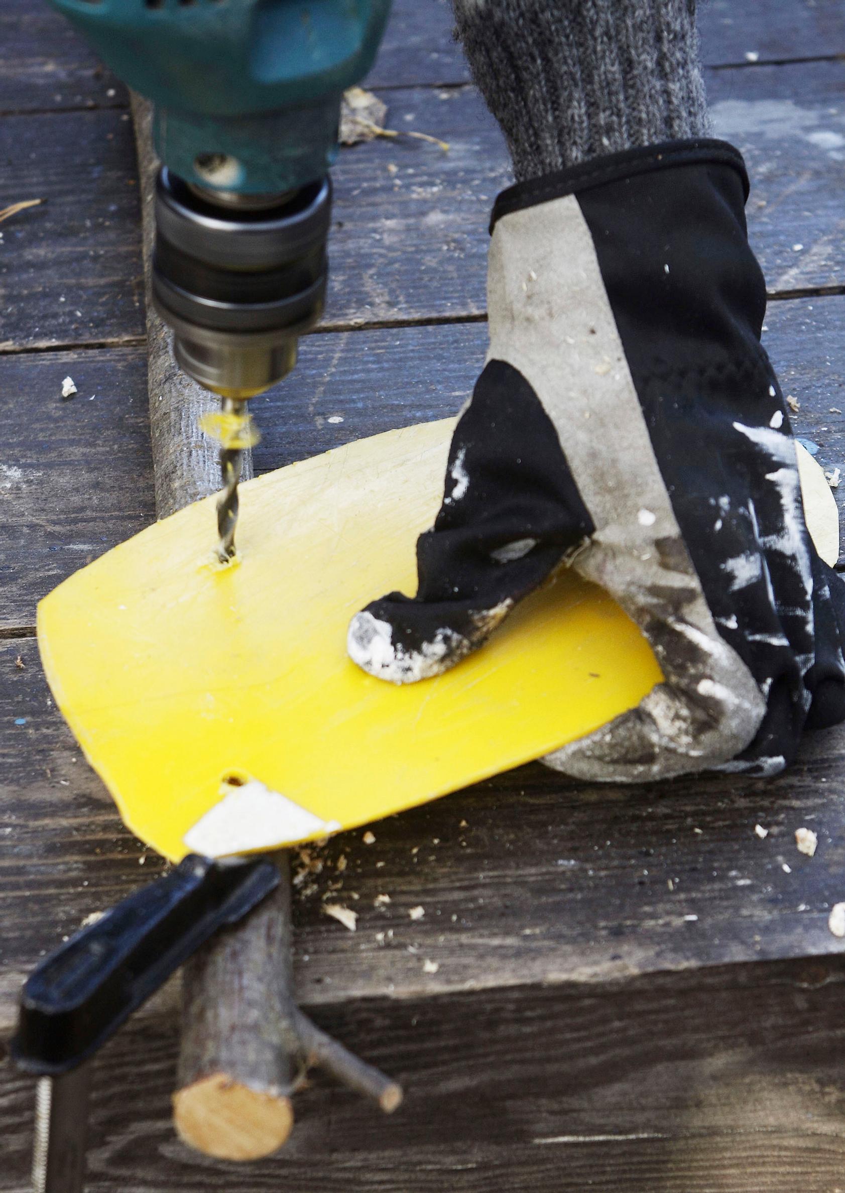 2. Kiinnitä keppi alustaan puristimilla ja laita muovikappale kepin päälle noin 45 asteen kulmaan keppiin nähden. Poraa sitten kaksi reikää läpän ja kepin läpi.