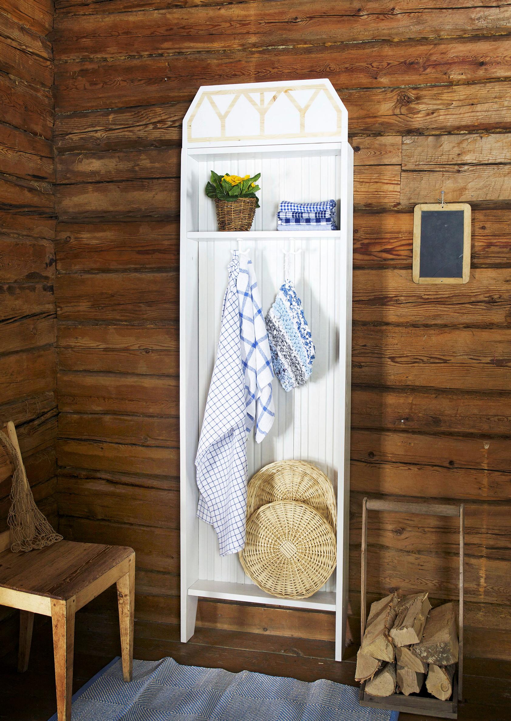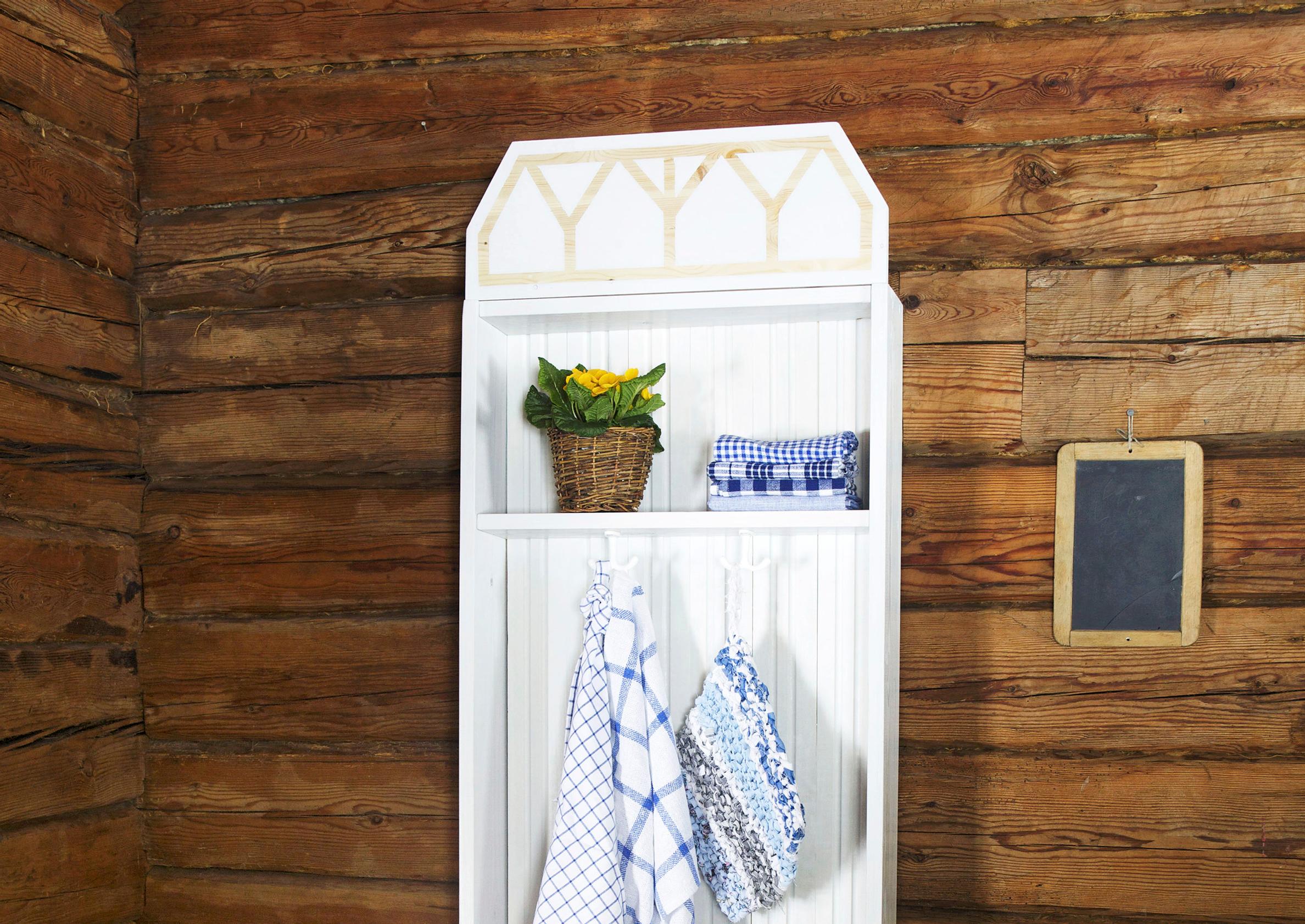 Nikkaroi jämälaudoista vaalea pyyhenaulakko mökkikeittiöön. Pyyhkeet ovat naulakossa helposti käsillä, ja pino puhtaita pyyhkeitä odottaa ylähyllyllä. Koristelauta viimeistelee kalusteen.