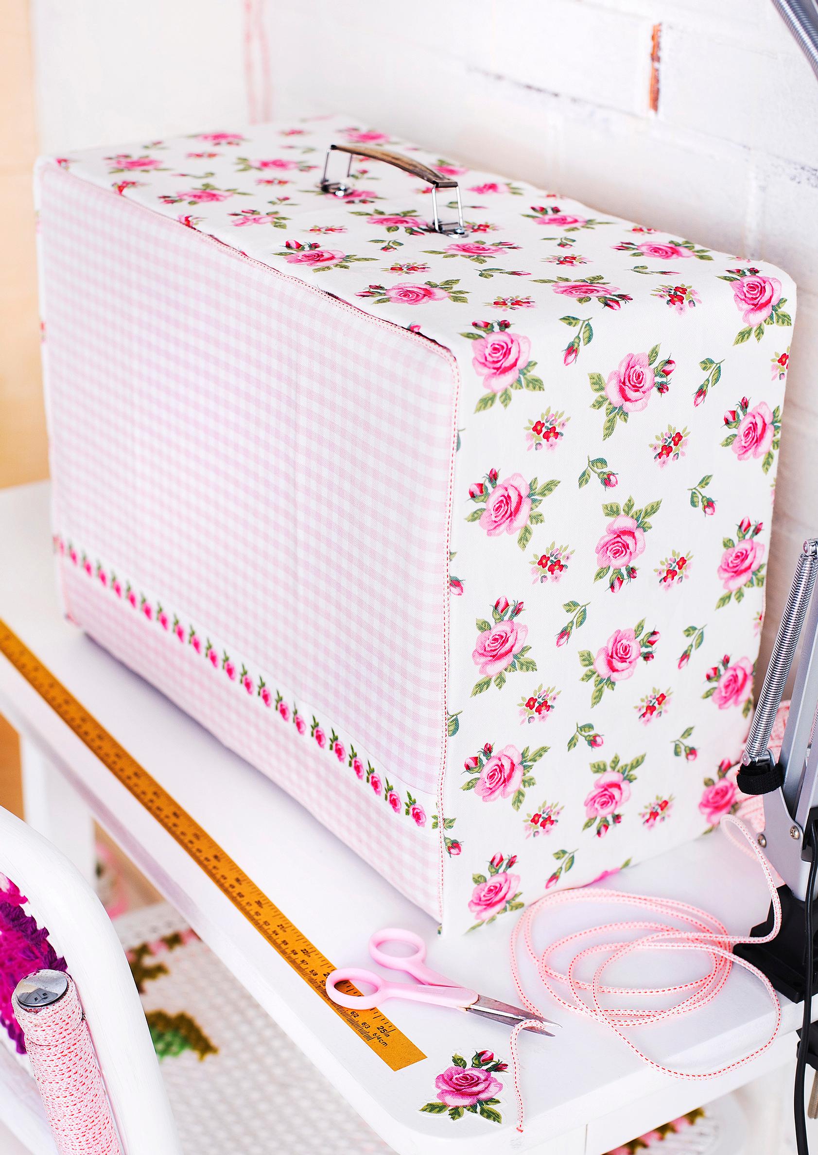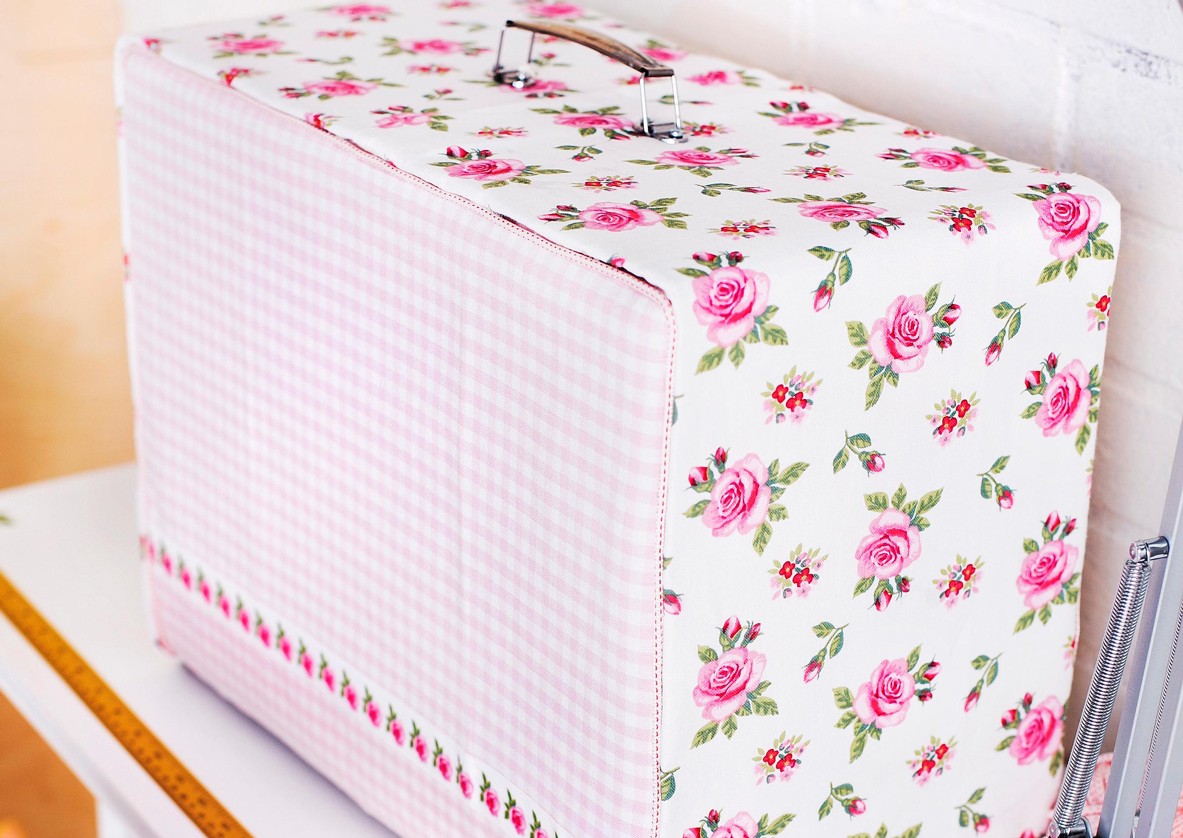 Kankaalla päällystämällä ompelukoneen suojakotelosta saa helposti omaan sisutukseen sopivan.