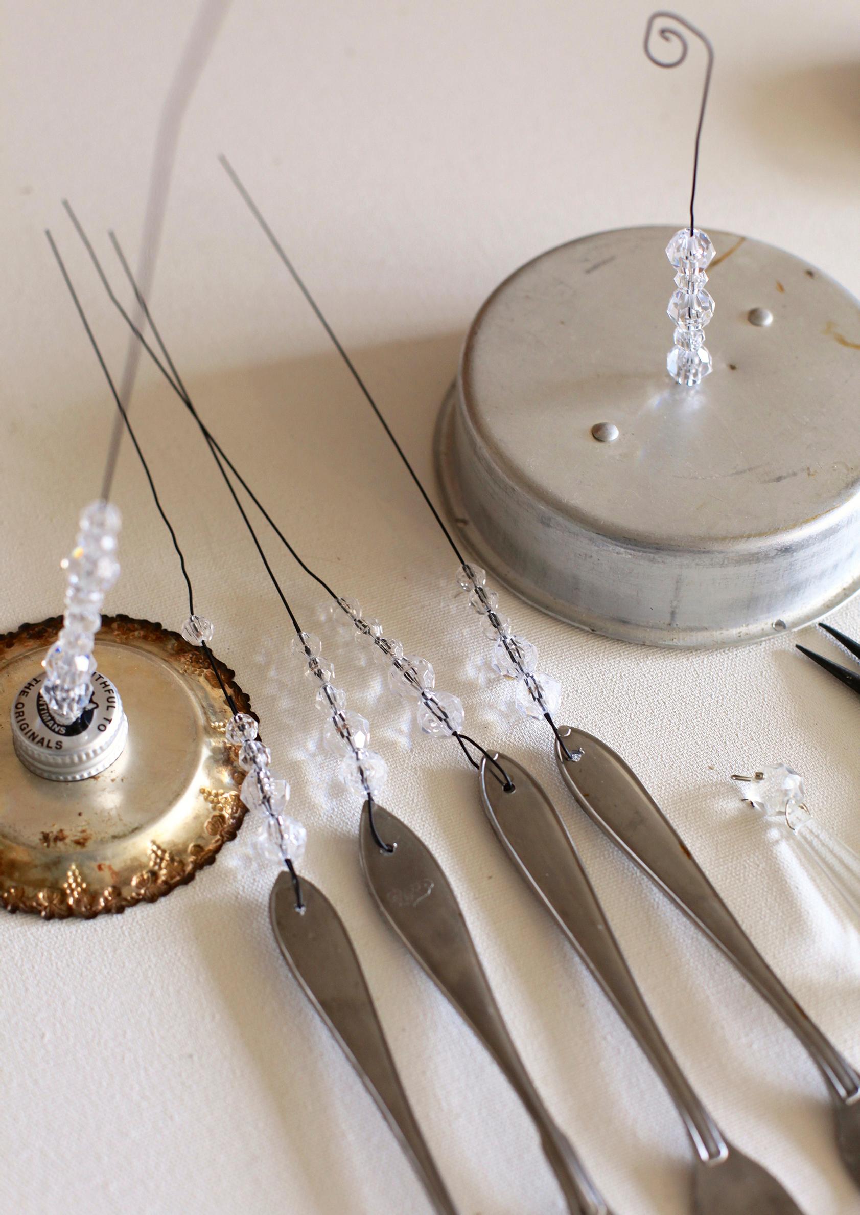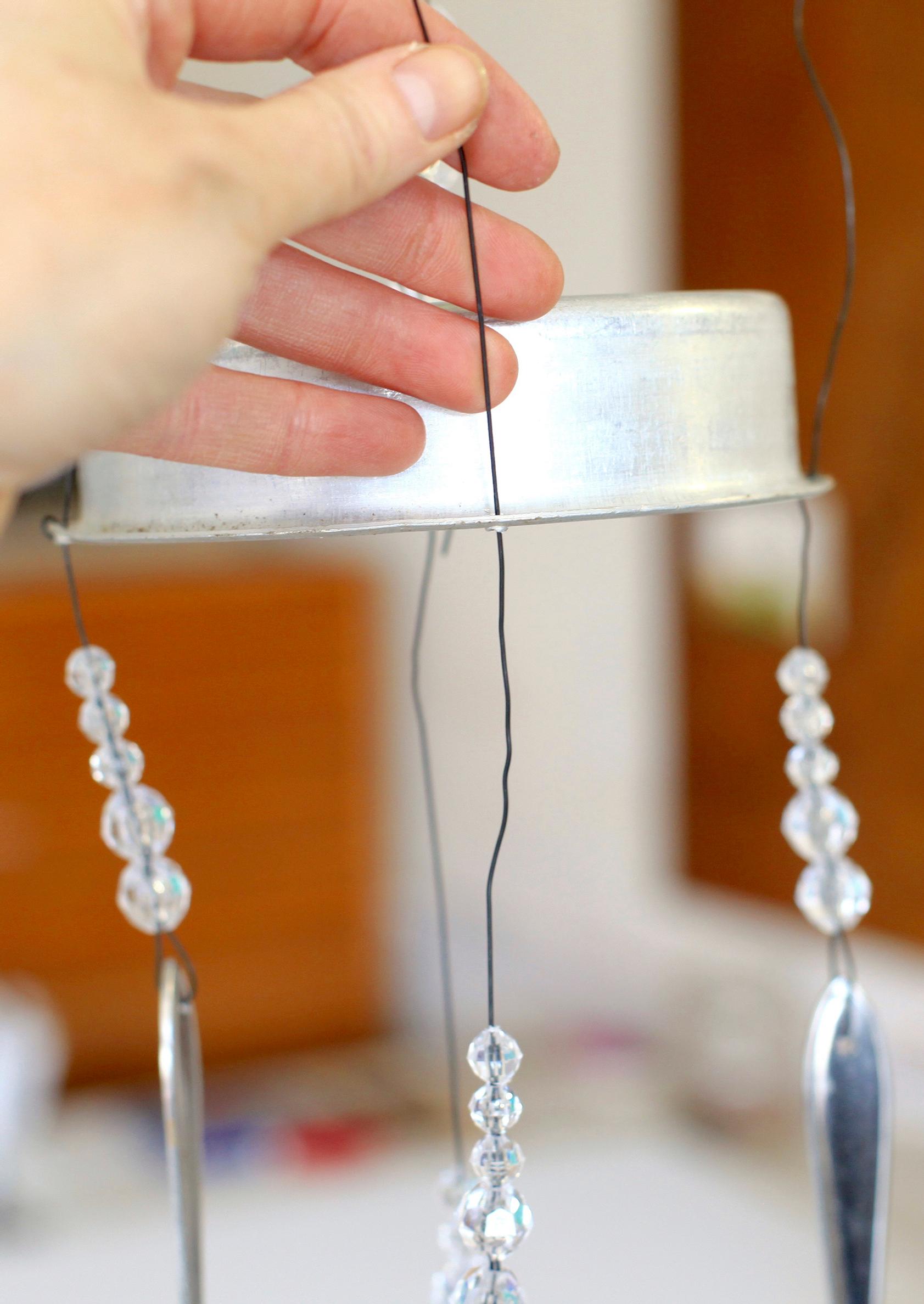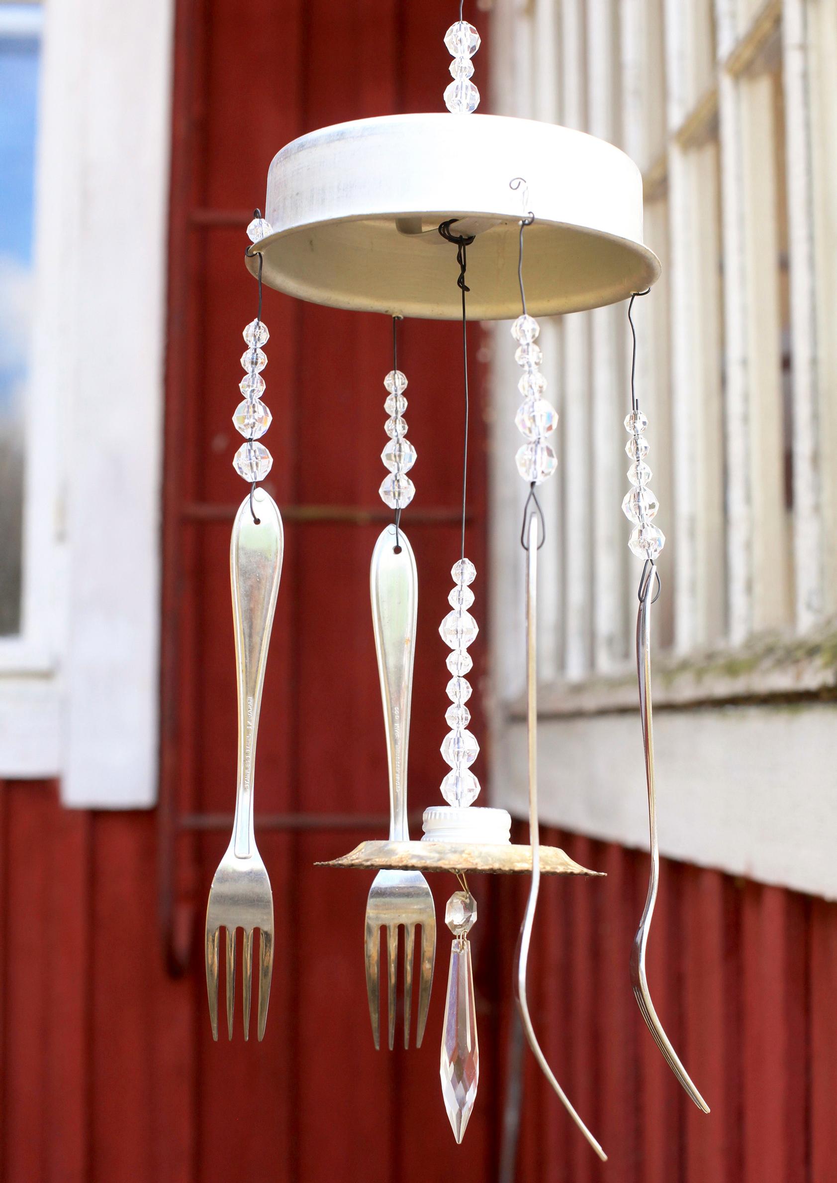 Tuulikellon materiaaliksi kelpaa kaikki metalli astioista aterimiin. Jos metalliromua ei löydä omasta takaa, kirpputoreilta saa mahtavia eripariaterimia ja kristalleja muutamalla eurolla. Myös raastinrauta näyttää komealta tuulikellossa.