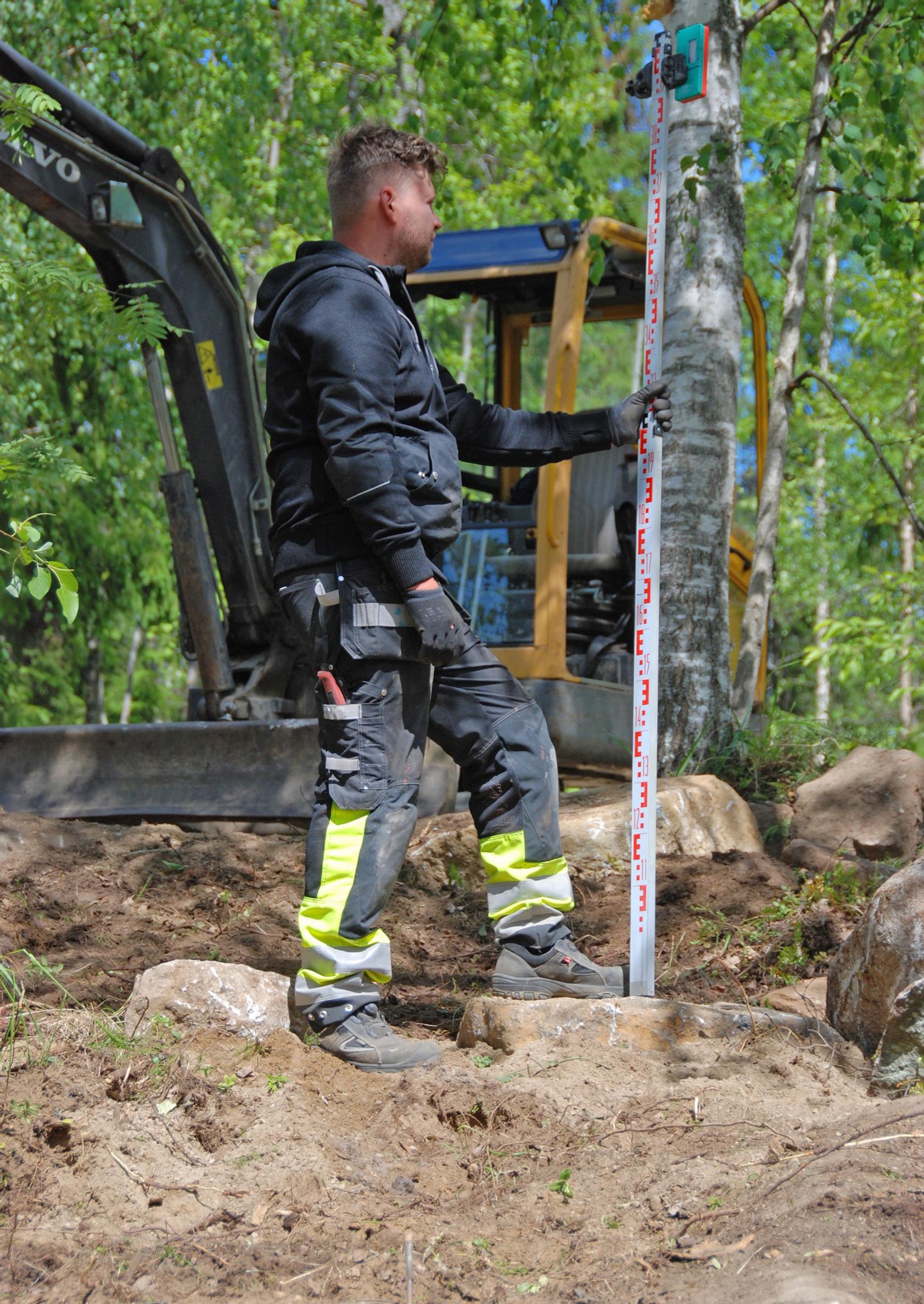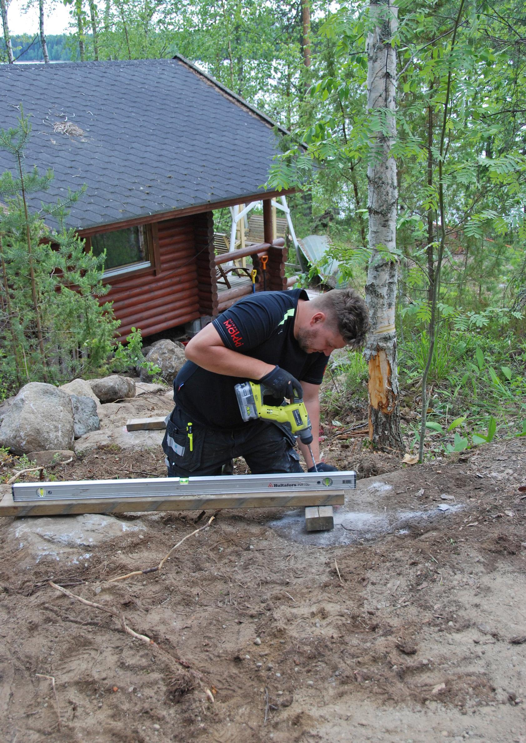 Puuportaiden rakennustyö alkoi perustuksista, jotka tehtiin huolella. Pienen kaivinkoneen avulla mökin isäntä raivasi portaille väylän, nosti perustuksia varten maasta luonnonkiviä ja asetteli ne sopiviin kohtiin hiekkamaahan.