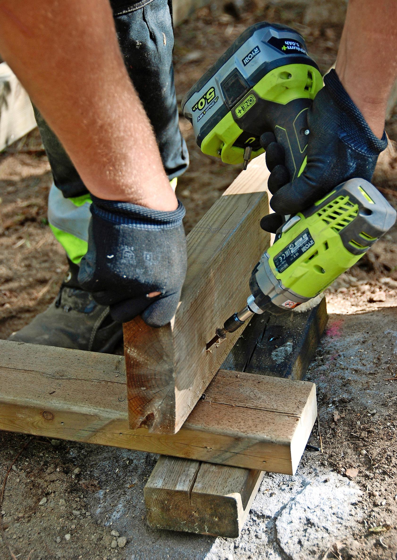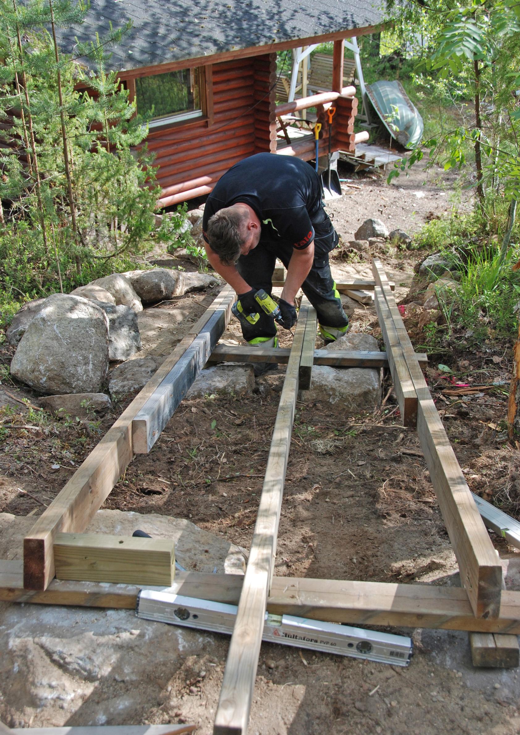 2. Asenna perustuskivien päälle poikittain portaiden levyiset tukipuut, joihin reisilankut on helppo kiinnittää. Säädä tukilankut suoraan puukiilojen ja vatupassin avulla. Lukitse lankut sopivilla kiinnikkeillä perustukseen.