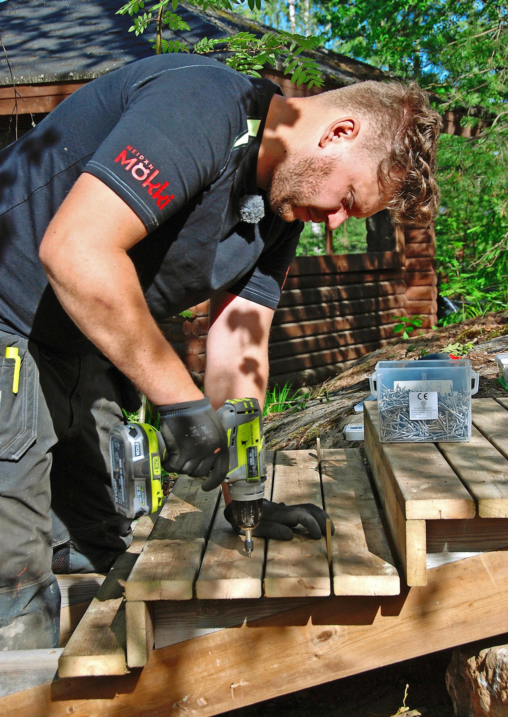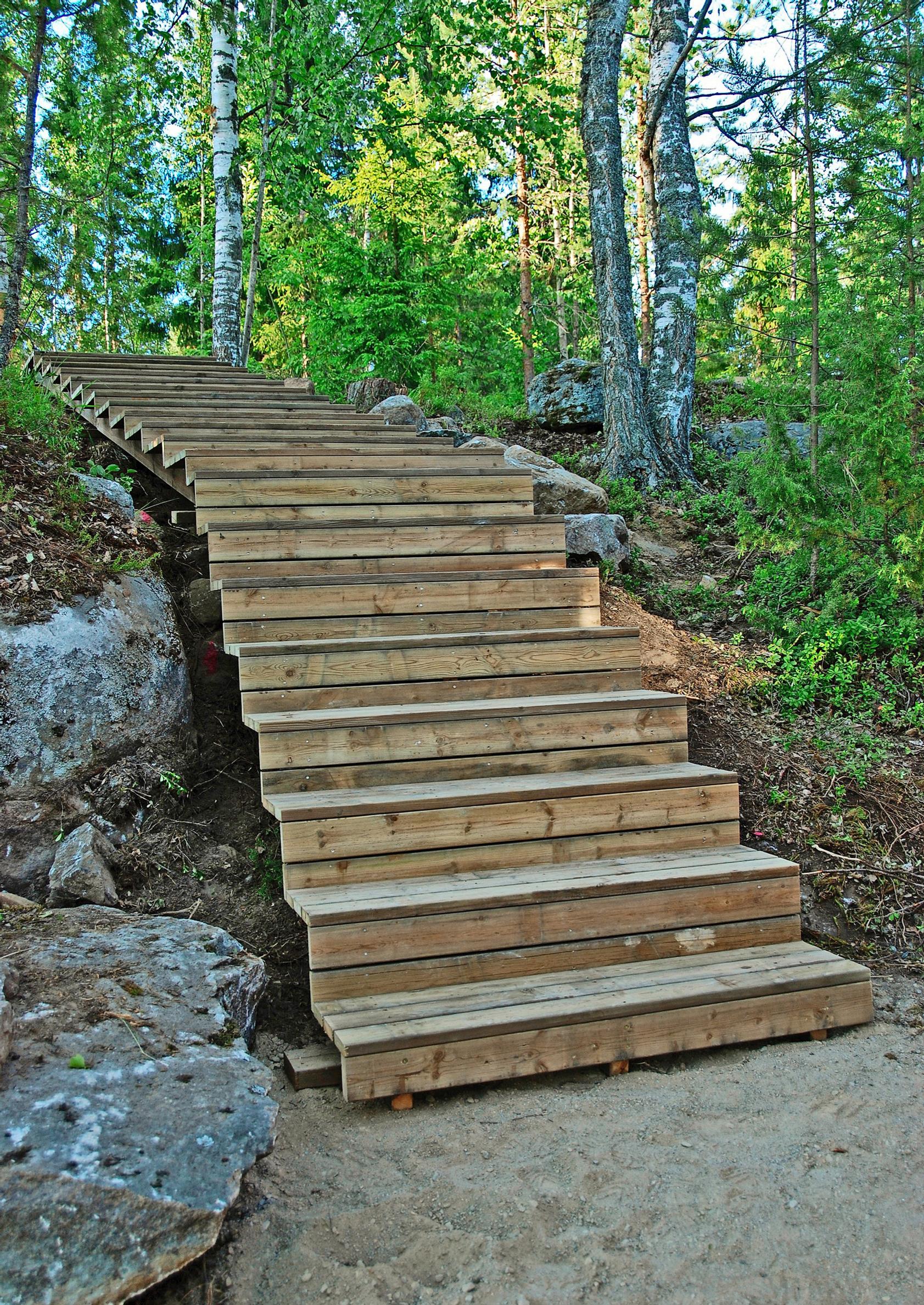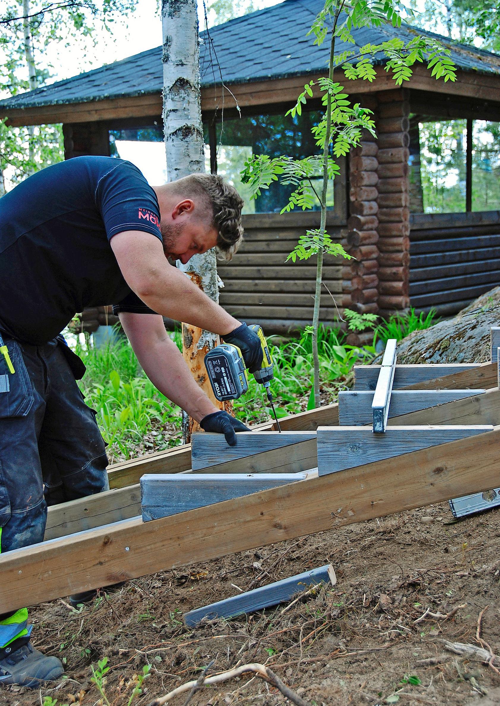 Timpuri Ari Lahti näyttää, kuinka rakennat turvalliset ja mökin pihapiiriin sopivat puuportaat kestopuusta. Kaiteet voi halutessaan tehdä puusta tai paksusta köydestä.