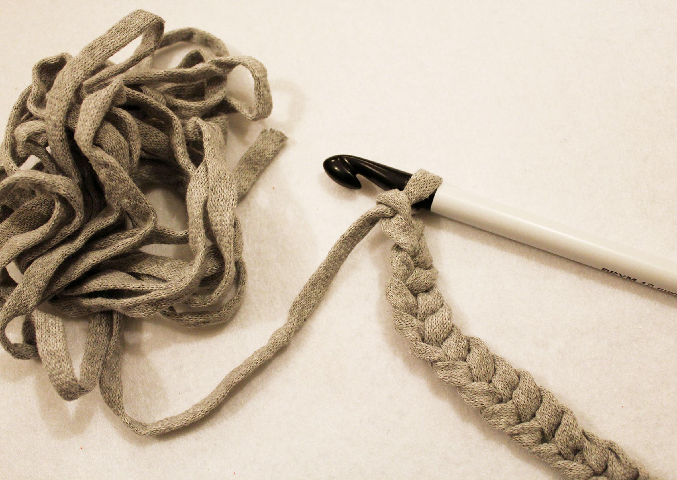 1. Virkkaa ketjusilmukkanauhaa kuteesta tai narusta. Saman näköistä nauhaa voit tehdä myös letittämällä. Kun nauhat ovat sopivan pituiset, solmi nauhojen päät.