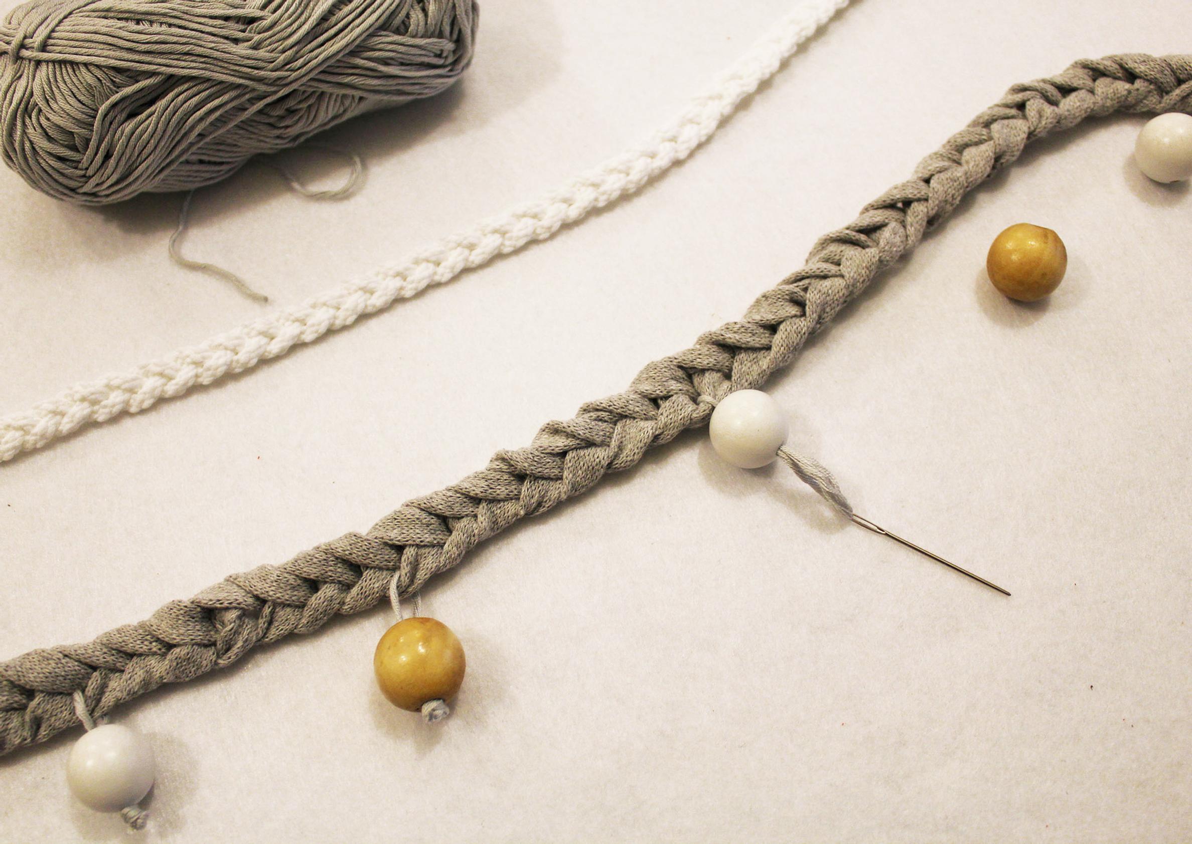 2. Lisää puuhelmiä langoilla nauhojen silmukoihin. Neulan avulla työ käy näppärästi.