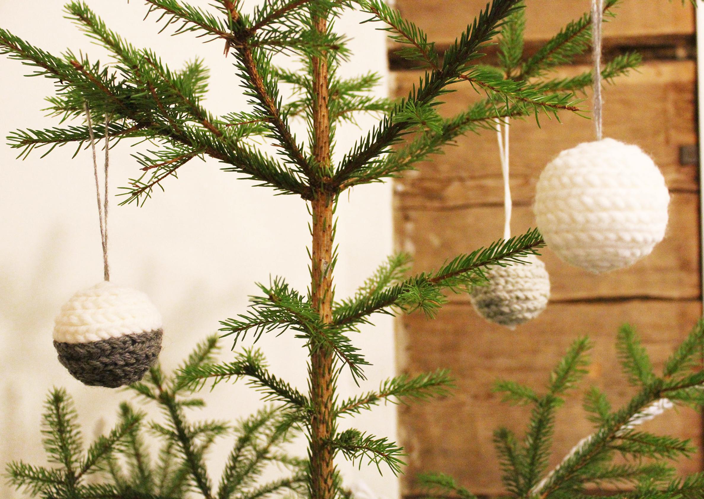 Virkatut joulukuusen koristeet valmistuvat näppärästi ontelokuteesta ja puuhelmistä. Kapea, lettimäinen nauha ja langalla päällystetyt pallot näyttävät moderneilta kuusen oksilla.
