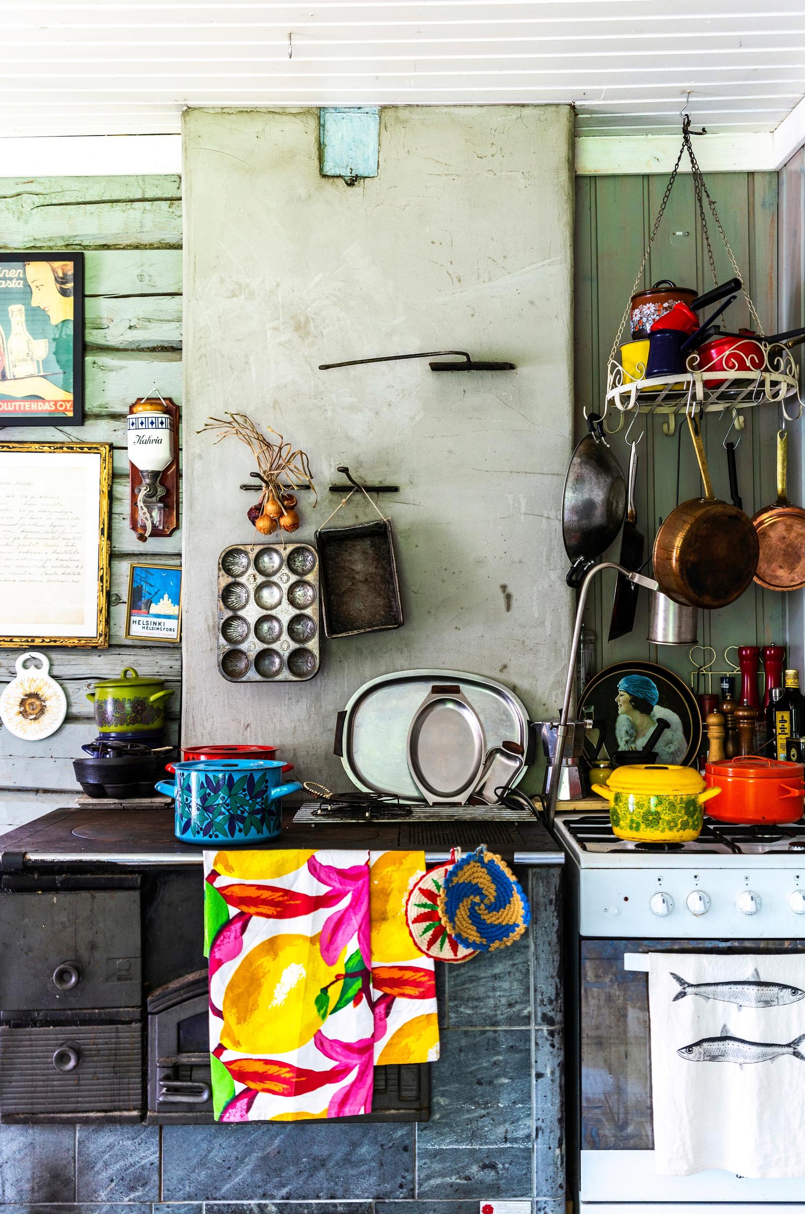 Pöytäliina on Marimekon vintagekangasta. Istuimina ovat Thonet-tuolit. Kaapin päällä on joukko Hackmanin ja Finelin kattiloita. Valaisin löytyi nettikaupasta. Sen johto on askarreltu piiloon Harrin sorvaamilla puuhelmillä. Kukkalautasen on suunnitellut Raija Uosikkinen 1970-luvulla Arabialle.
