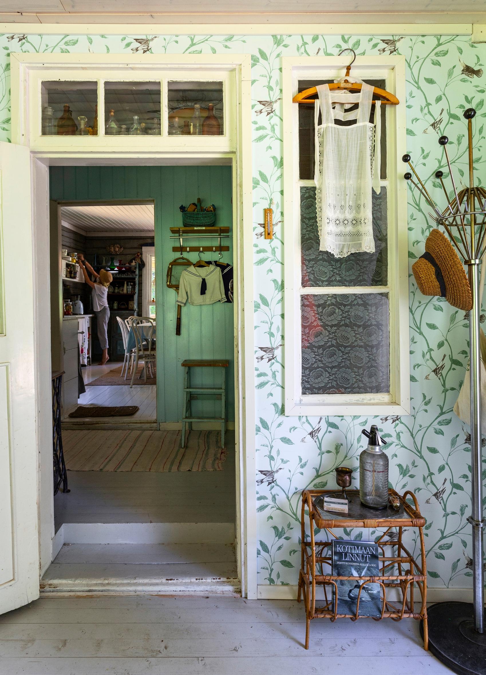 Kuistin köynnöstapetti hankittiin RTV:ltä. Pikkuikkuna oli alun perin vanhan ulko-oven vieressä. Ruusukuvioinen ikkunalasi on alkuperäinen. Teija loi rottinkitasolle asetelman soodasifongista, vanhasta tupakka-askista ja hopeisesta juoma-astiasta. Vanha pitsinen lastenessu ikkunassa on Ruotsista.