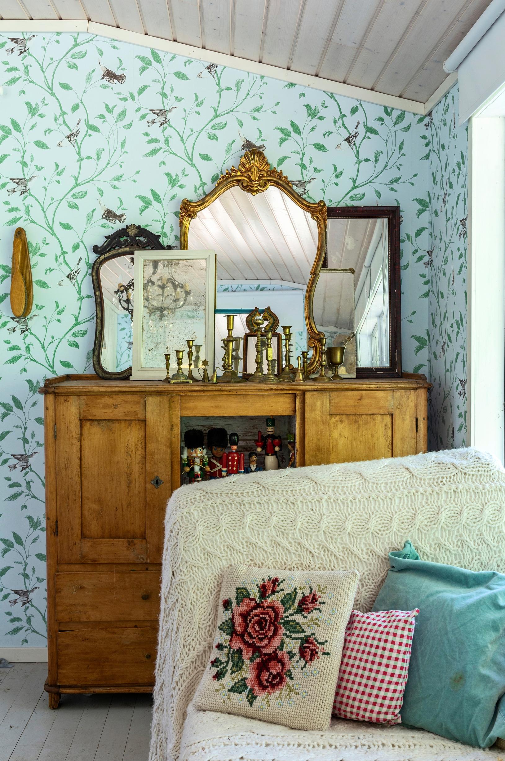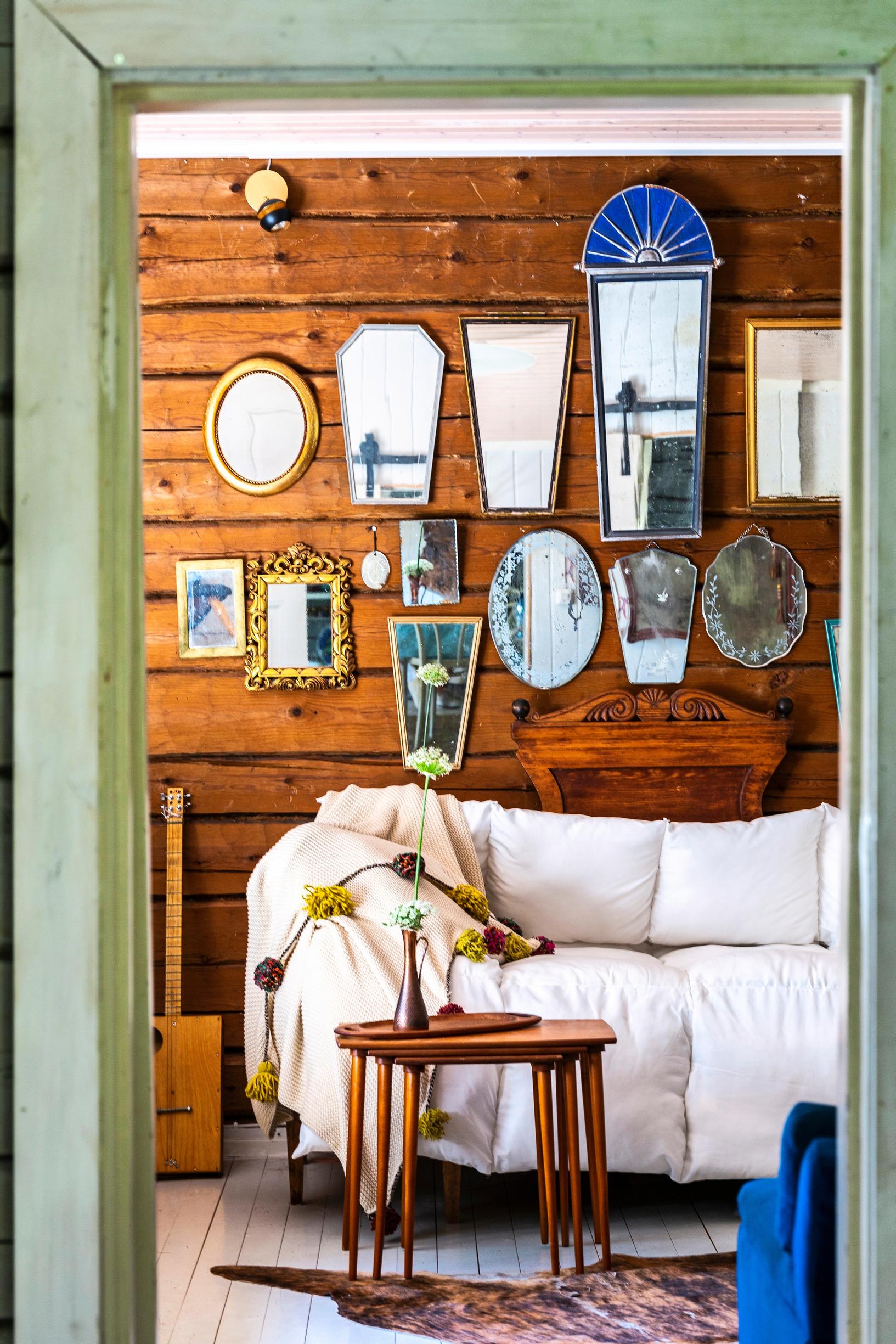 Olohuoneen seinä on talon alkuperäistä hirttä. Peilikokoelma on karttunut vuosien mittaan. Teija on kerännyt peilejä aina. ”En minä itseäni niistä peilaile! Peilit tuovat valoa tilaan kuin tilaan ja taittavat valoa hienosti. Seinä on kuin alati muuttuva taideteos.”