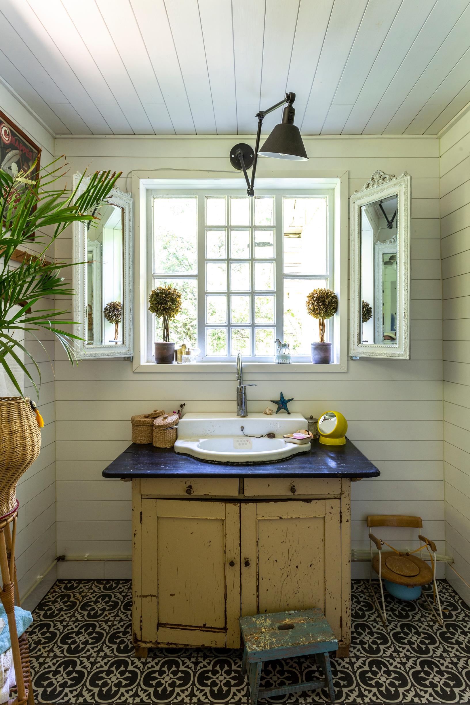 Uuden kylpyhuoneen suunnittelu lähti siitä, että oikeanlainen ikkuna löytyi Helsingin Aurinkolahdesta. Sen kerrottiin olevan lähtöisin hämeenlinnalaisesta purkutalosta, joten se palasi takaisin kotiseuduilleen. Harri kiinnitti siihen saranoilla vanhat peilit. ”Remppamiehemme Tapsa teki kovasti työtä, että sai istutettua lavuaarin ikivanhaan kaappiin.”