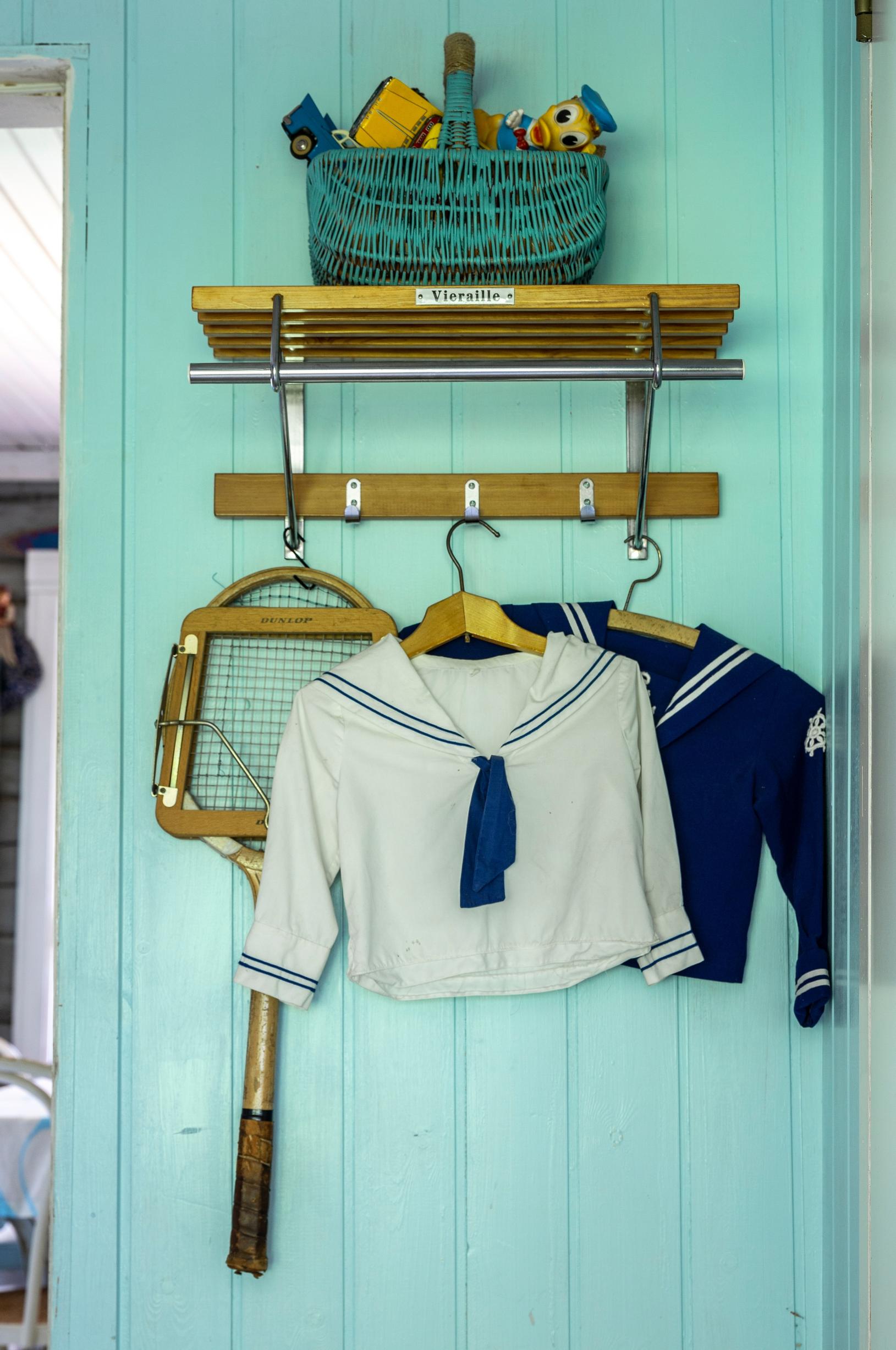 Perheen Jere-pojalle lapsena teetetty valkoinen merimiespaita koristaa eteisen vierasnaulakkoa. ”Vanha Dunlop-tennismaila on siinä murtovarkaiden varalta”, Teija varoittaa.