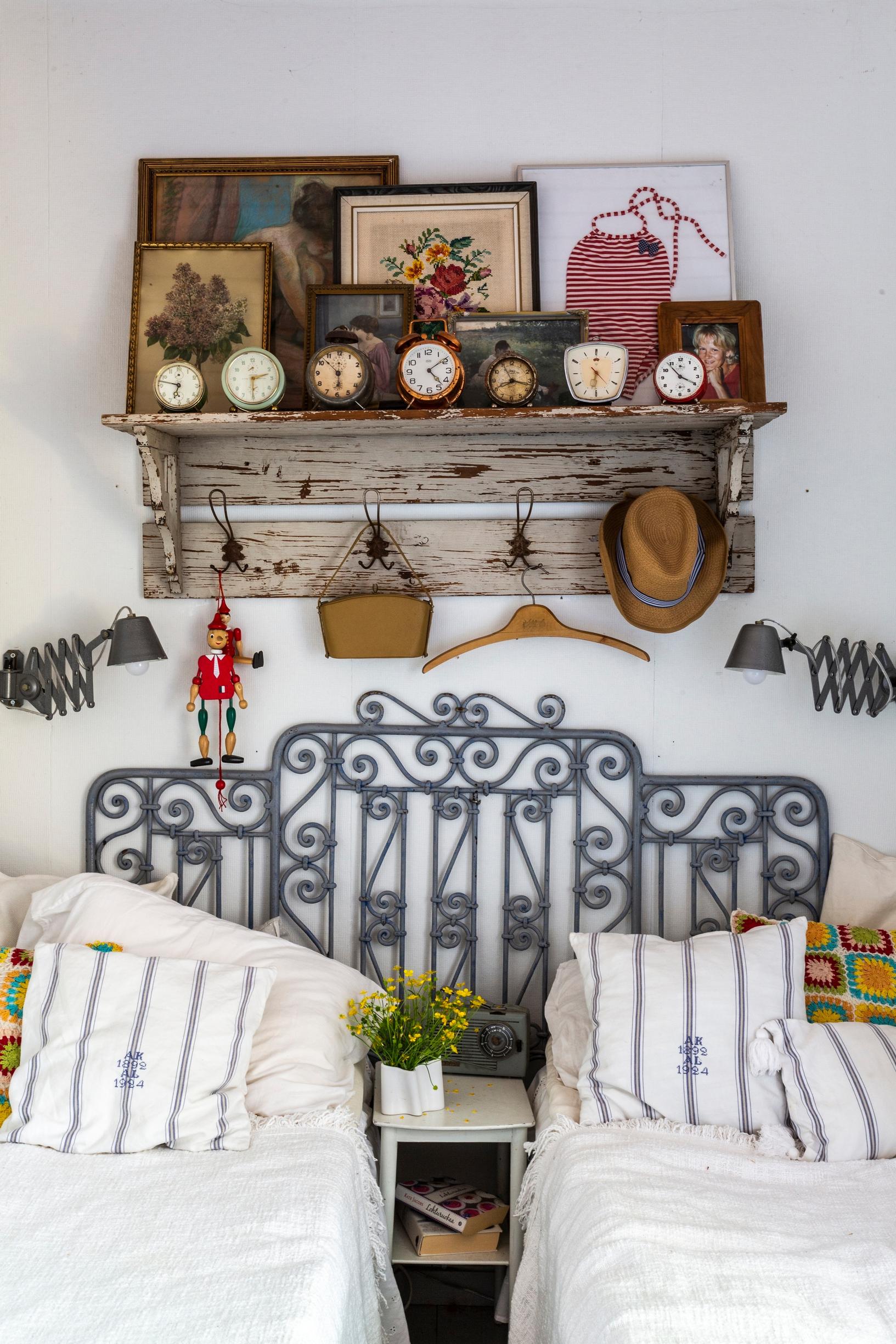 Sängynpääty on painavaa metallia. Se hitsattiin kahdesta palasta. ”Naulakko hilseilee niin, että jos oikein rivakasti kääntyy sängyssä, saa maalit niskaansa. Ja herätyskellon!” Lukuvaloina ovat vanhat tšekkiläiset työvalaisimet.