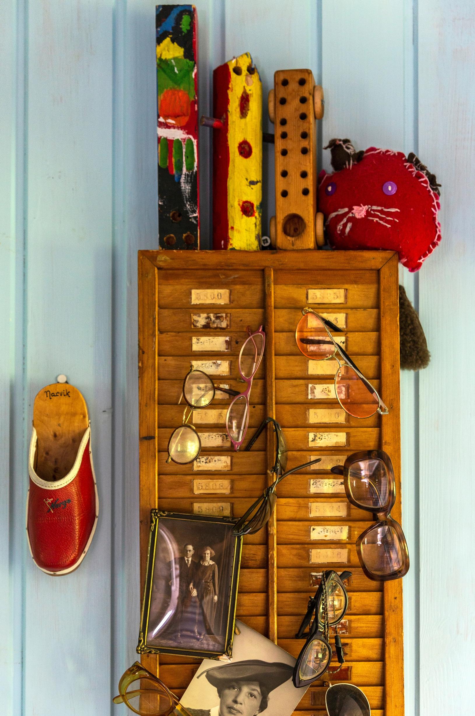 Eteisen asetelma muotoutui VR:n kellokorttitelineen ympärille. Esillä on muun muassa lasten koulussa tekemiä puu- ja ompelutöitä. Minkälaisen tarinan sinä rakentaisit näistä elementeistä?