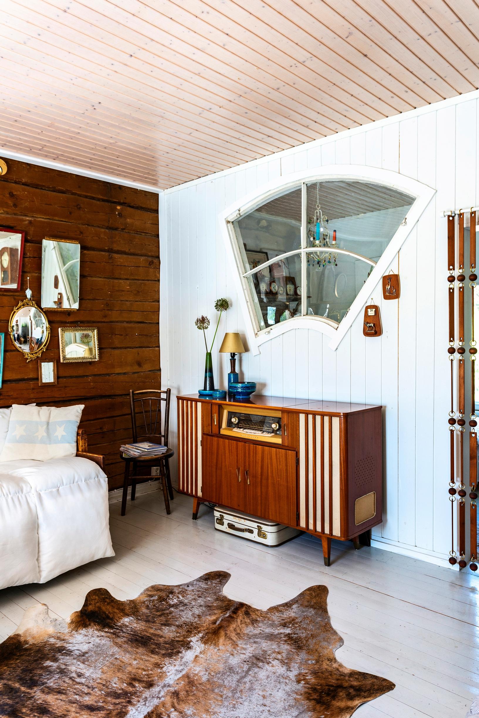Olohuoneen katseenvangitsija on satakiloinen, yhä toimiva jalopuinen putkiradio, kirppislöytö. Ikkunan takana on makuuhuone. Ikkuna on osa suurempaa pyöreää kokonaisuutta, joka on aikoinaan koristanut helsinkiläistä rappukäytävää. Tasolla on italialaista Bitossi-keramiikkaa 1960-luvulta.