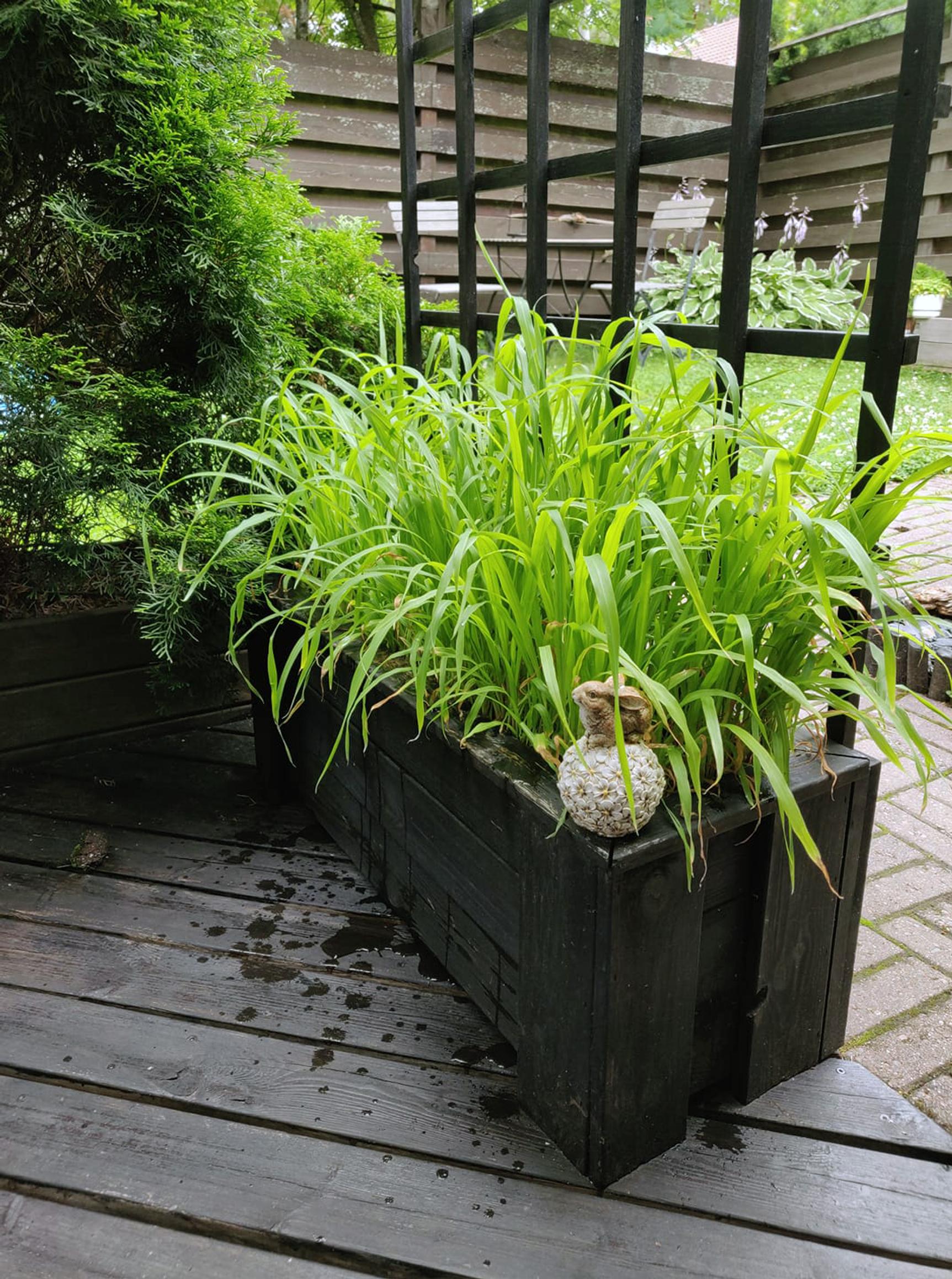 "Vuosi sitten kylvin pääsiäisruohot marketin popcorn-jyvistä. Koska ruohot näyttivät kasvavan hyvin pituutta, ajattelin kokeilla, kasvaisivatko sellaiset kesällä ulkona näyttäviksi. Kyllähän niistä kivat heinät kasvoi.