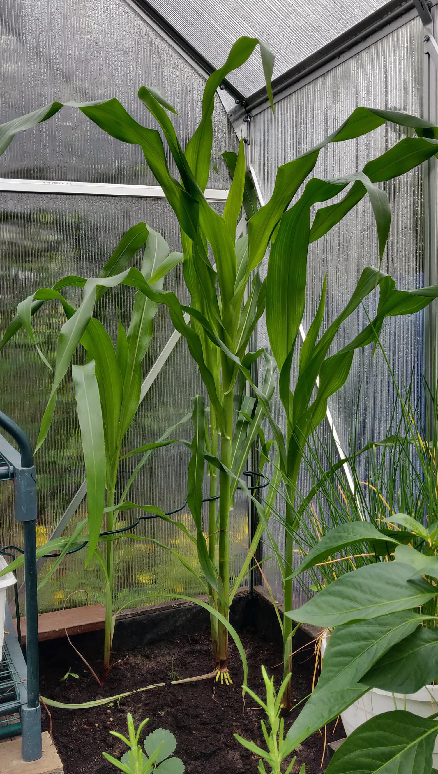 Erottelin pääsiäisruohoistutuksesta muutaman vahvemman korren erilleen esikasvatukseen. Kesäkuun alussa istuin taimet uuteen kasvihuoneeseen tavalliseen puutarhamultaan. Kastelin maisseja kuten muitakin kasvejani, ehkä ne saivat hieman vähemmän vettä ja lannoitetta.