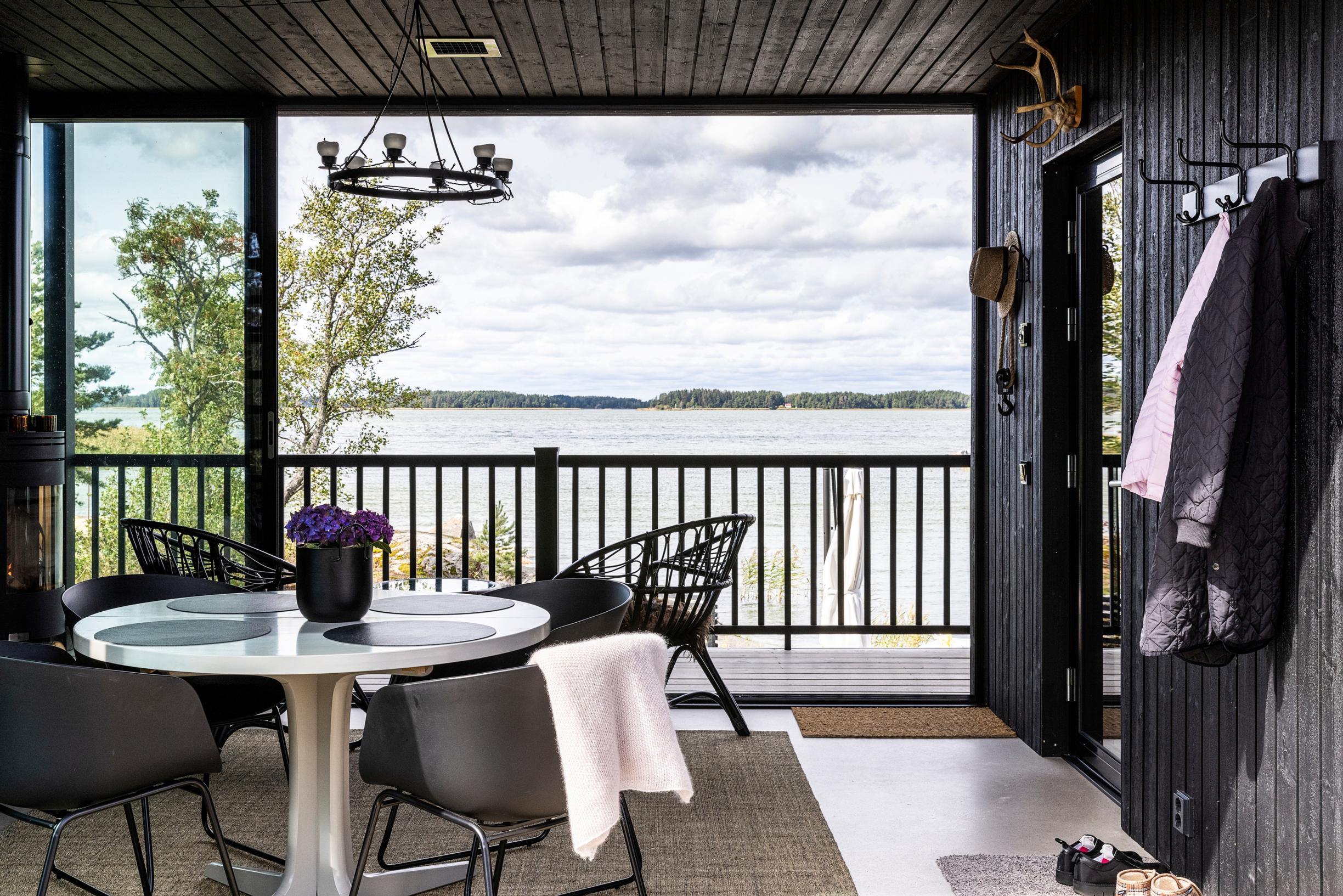 Kun terassi on kokonaan lasitettu ja tila riittävän iso, se todella on kuin yksi ylimääräinen huone. Espoolaisessa kivitalossa tällaisia terasseja on kaksi, yksi yläkerrassa ja toinen alakerrassa. Yläkerran lasitetulta parvekkeelta avautuu rauhoittava metsänäkymä, alakerran lasiterassilta avautuu lisäksi ovi patiolle.