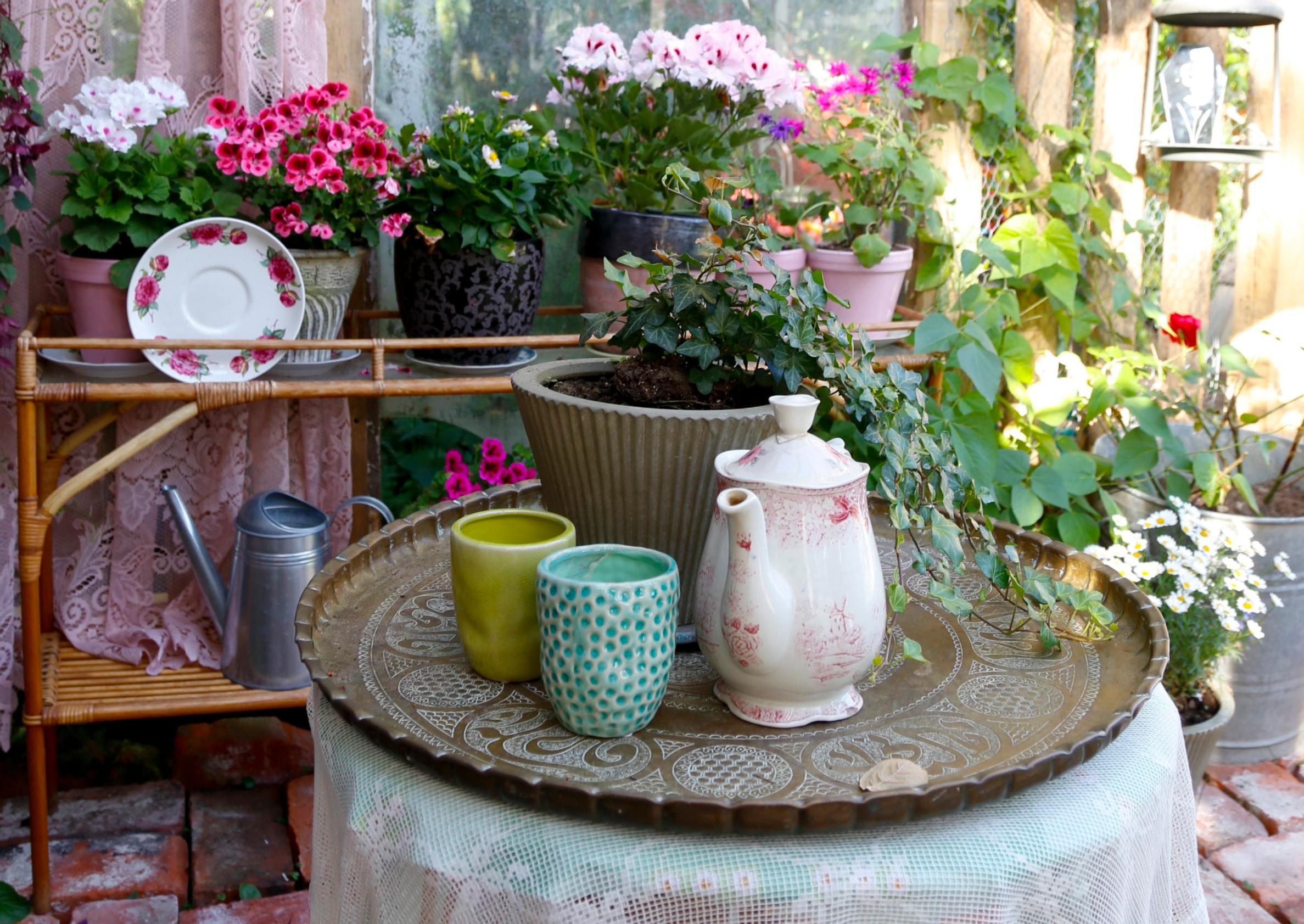 Melkein kuin olohuoneessa, mutta sittenkin taivasalla! Tuulensuojaseinän eteen ripustetut pitsiverhot ja posliininen kahvikannu luovat herkullista harhaa olohuoneesta, ja rottinkikukkapöytä täyttää tehtävänsä ulkonakin.