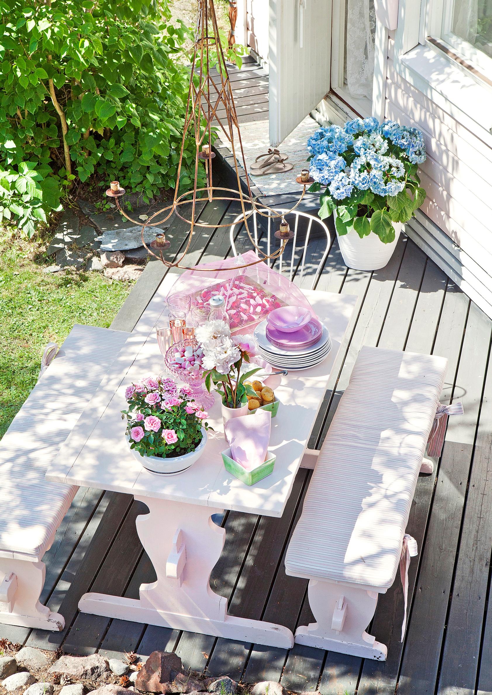 Vanha pirttikalusto saa uuden elämän terassin keskipisteenä. Valkoiseksi maalattuna se sopii loistavasti talon romanttiseen tyyliin. Irtopehmusteet tuovat penkkeihin uutta mukavuutta.