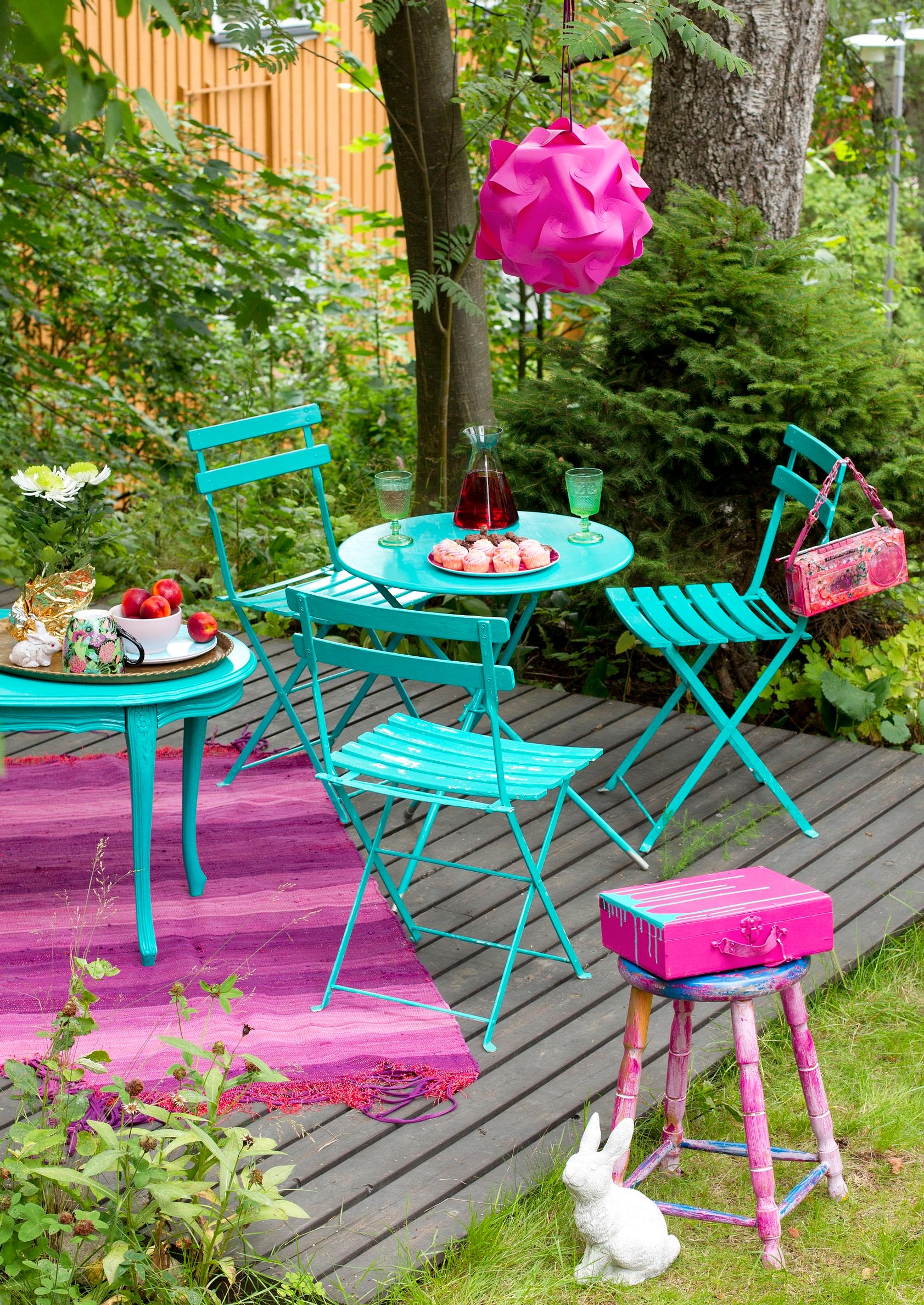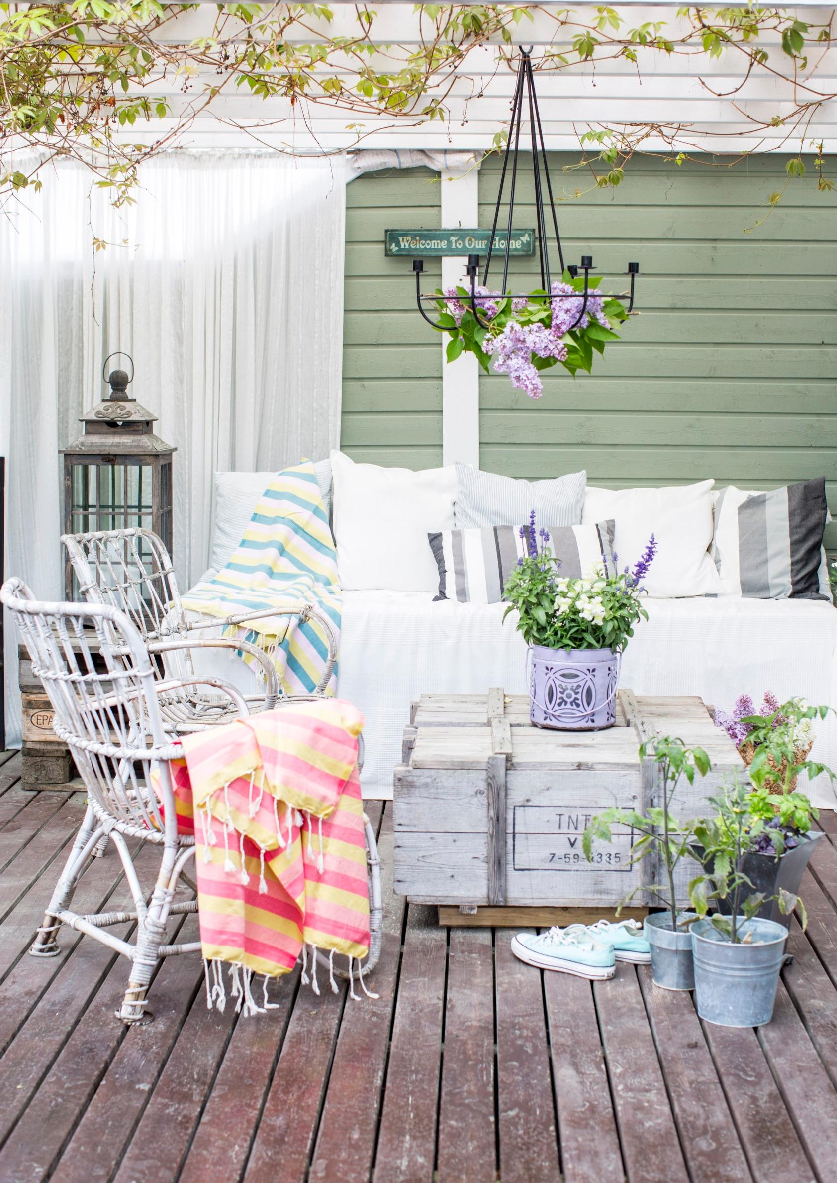 Hillityn tyylikäs terassi näyttää isolla rahalla kootulta. Paitsi ettei ole. Arkkupöytä on dynamiittitehtaan laatikko. Sohvan runkona on siirtolavoja ja pehmusteina vanhoja patjoja. Kaiken kukkuraksi rottinkituolitkin on löydetty kirppareilta.