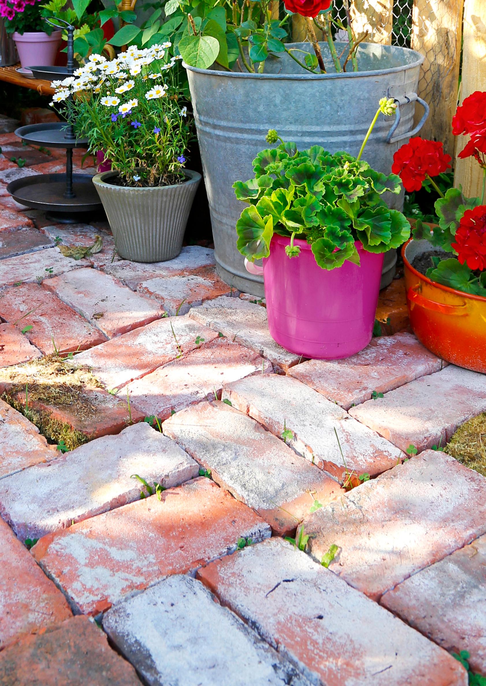Vanhoista tiilistä syntyy ihanan patinoitunut lattia oleskelualueelle. Kattiloin ja peltisaavein vahvistettu iloinen ruukkukokoelma sopii hienosti boheemiin tyyliin.