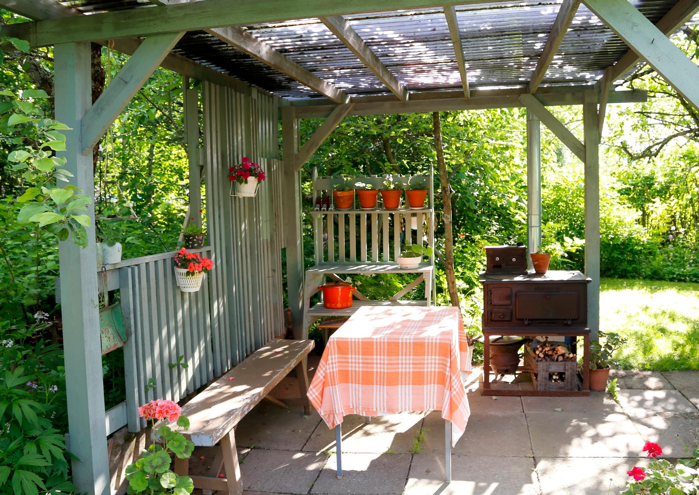 Massiivinen grillikompleksi on terassin kunkku, vai onko sittenkään? Tämän viehättävän pihakeittiön sydän on vanha puuhella. Uudenkiiltävä teräspiippu antaa sille hyvän vedon.