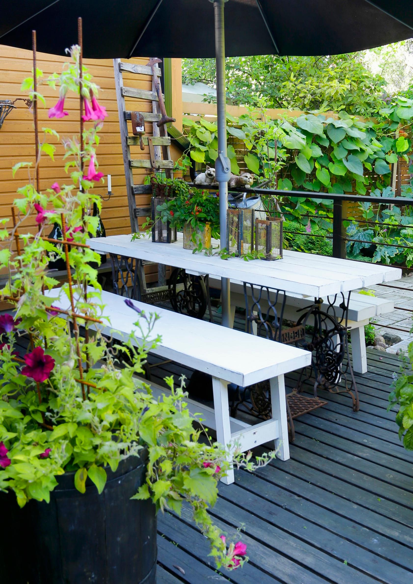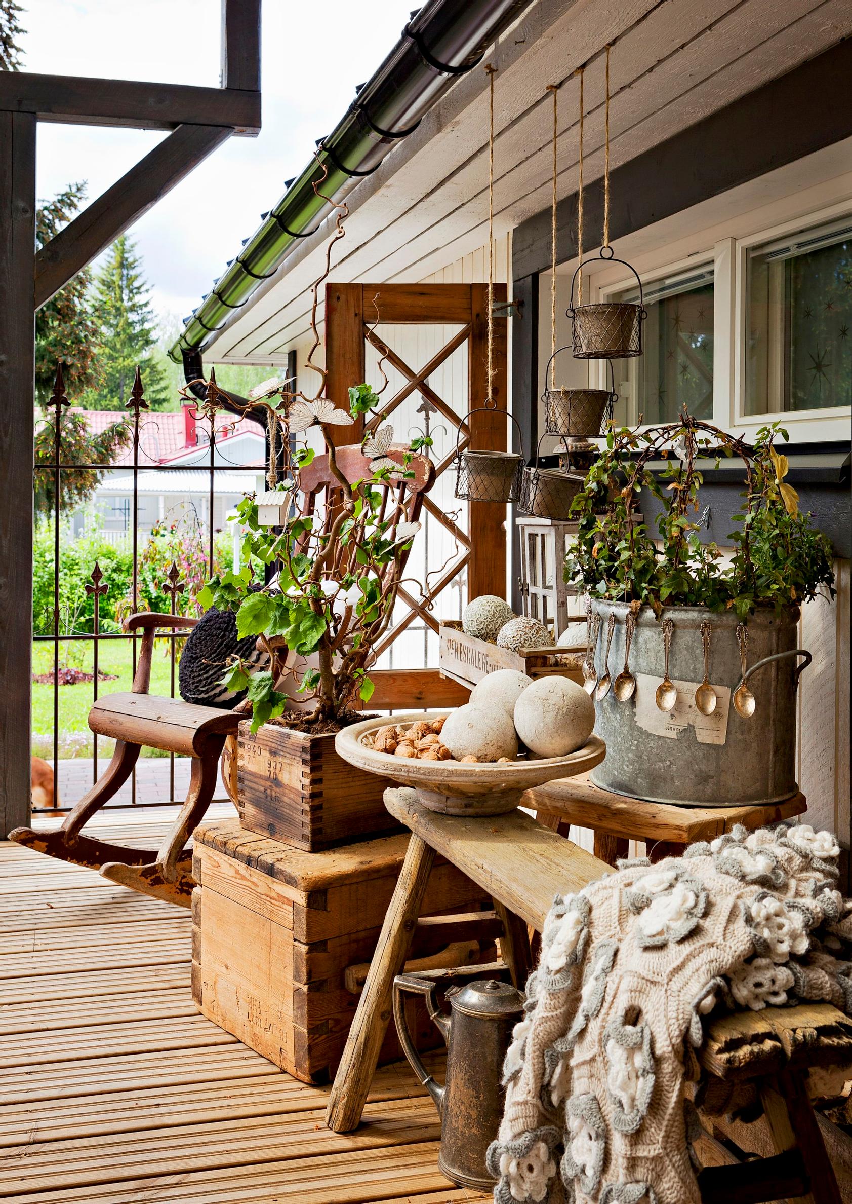 Kukat eivät ole terassin ainoita somisteita. Patinoituneesta puupenkistä, perunakapoista, alumiinikattilasta ja jopa alpakkalusikoista syntyy mielenkiintoinen asetelma.