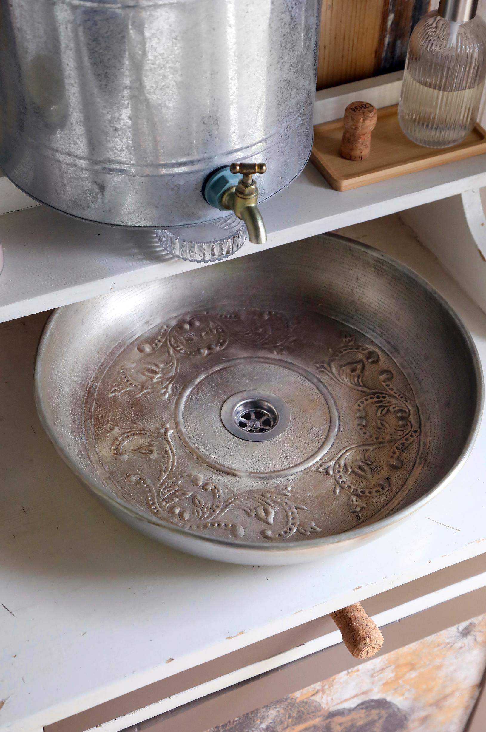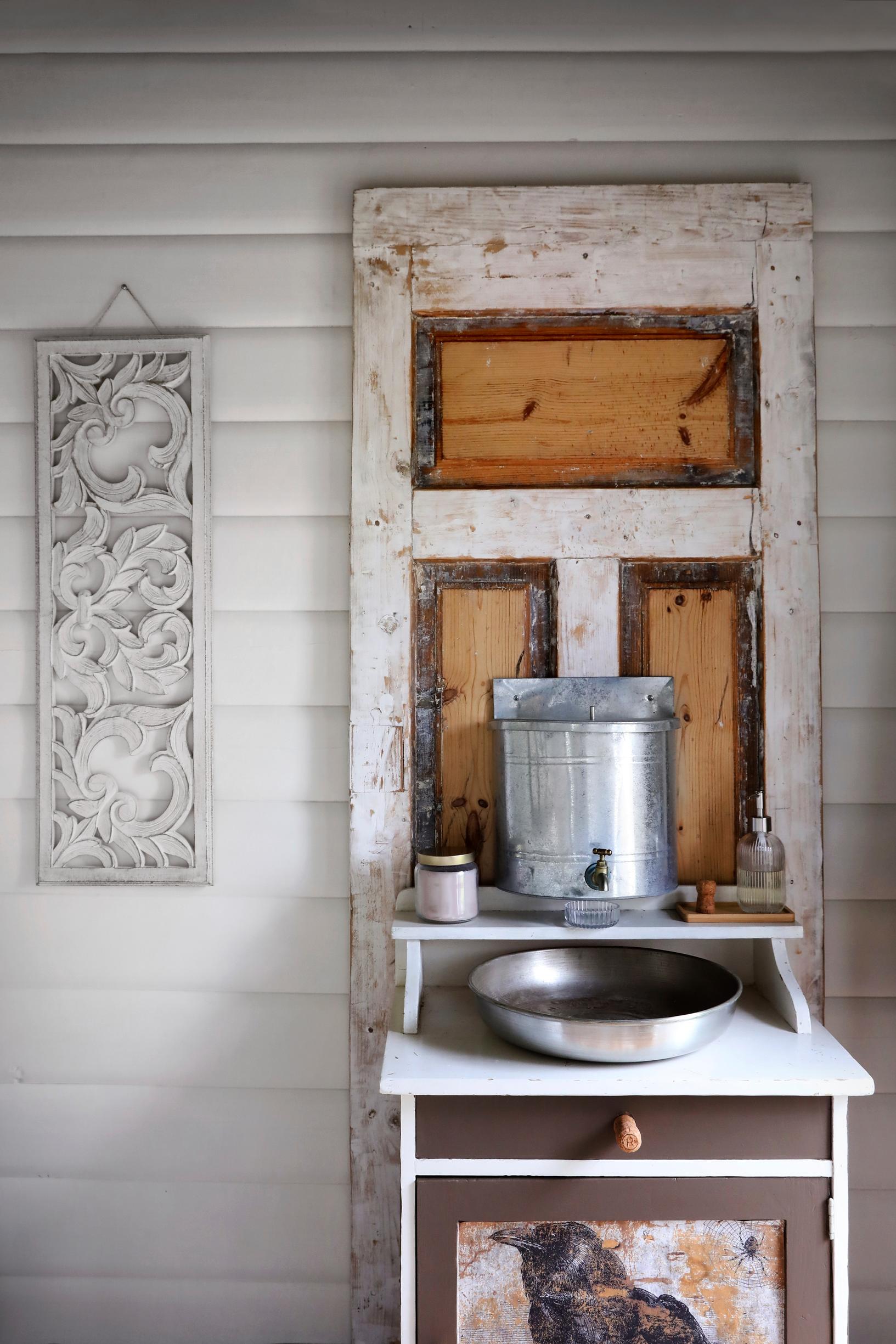 Sisustuksen teemana toimi ”boho maustettuna kierrätetyllä sisustuskrääsällä”. Uutena hankittiin ainoastaan poistoputki lavuaariin sekä Kekkilän kompostoiva kuivakäymälä, jonka kriteerinä oli sievä ja kevyt ulkonäkö. Kaikki muu tarvittava löytyi omista aarrevarastoista.