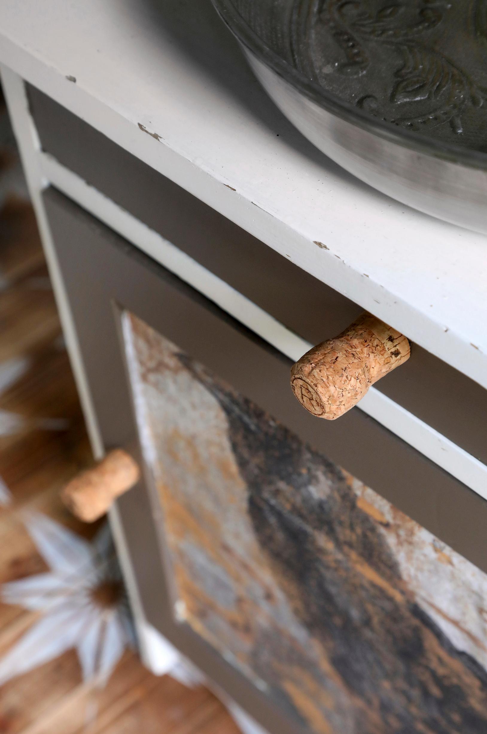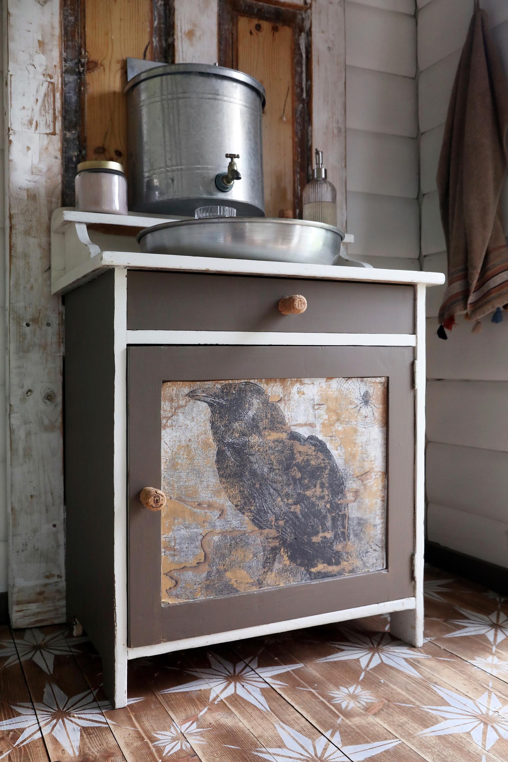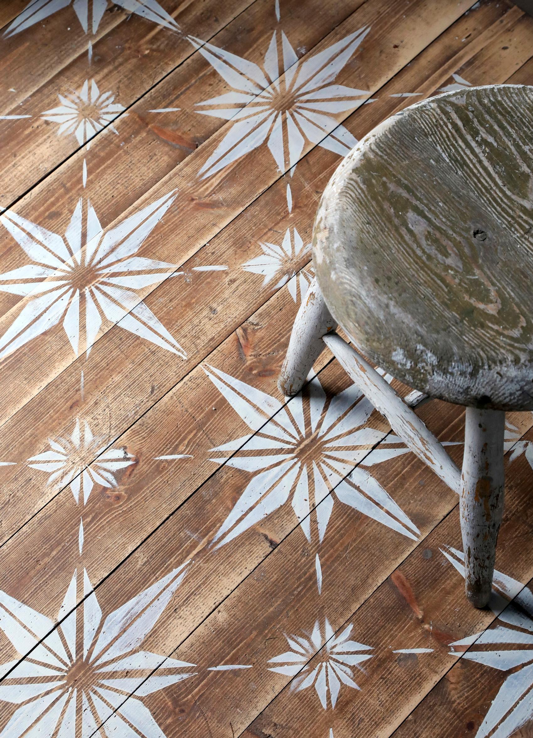 Puulattiassa oli ennestään vanha petsi. Kevyen hionnan jälkeen pinta oli niin kaunis, että Teresa päätti jättää pohjan sikseen ja maalasi vain sapluunalla pintaan kauniin tähtikuvion.