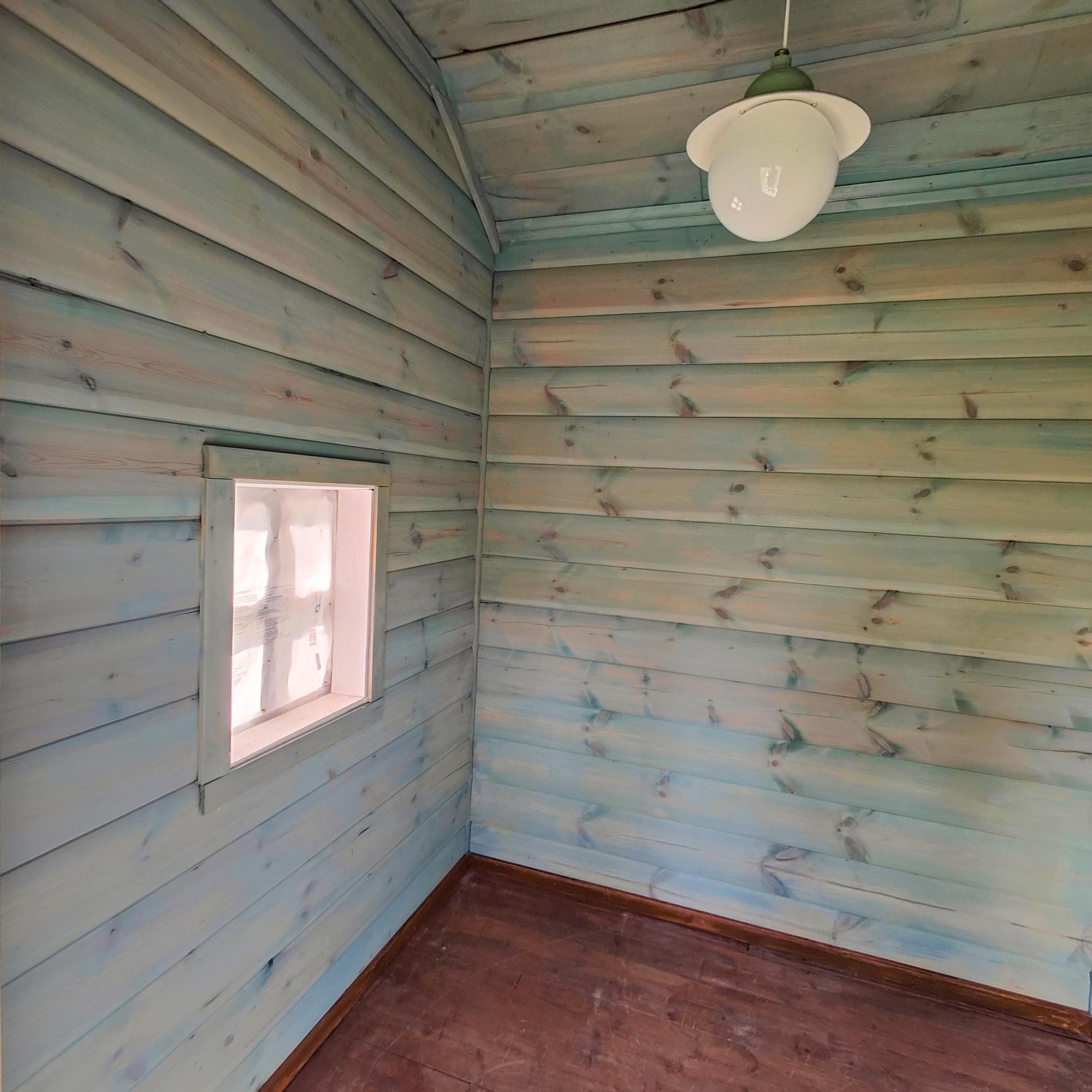 Pintojen puhdistuksen jälkeen kattoon maalattiin mineraalimaali. Seinäpaneelit jätettiin paikoilleen, ja Teresa maalasi ne maitomaalilla. Se osoittautui varsinkin katonrajassa haasteelliseksi, koska maali oli ohutta, valuvaa lirua. Vaadittiin arvioitua useampi maalikerros, jotta myrkynvihreä väri peittyi kunnolla. Maalien säänkestävyys on vastoin yleistä käsitystä osoittautunut käytännössä hyväksi.