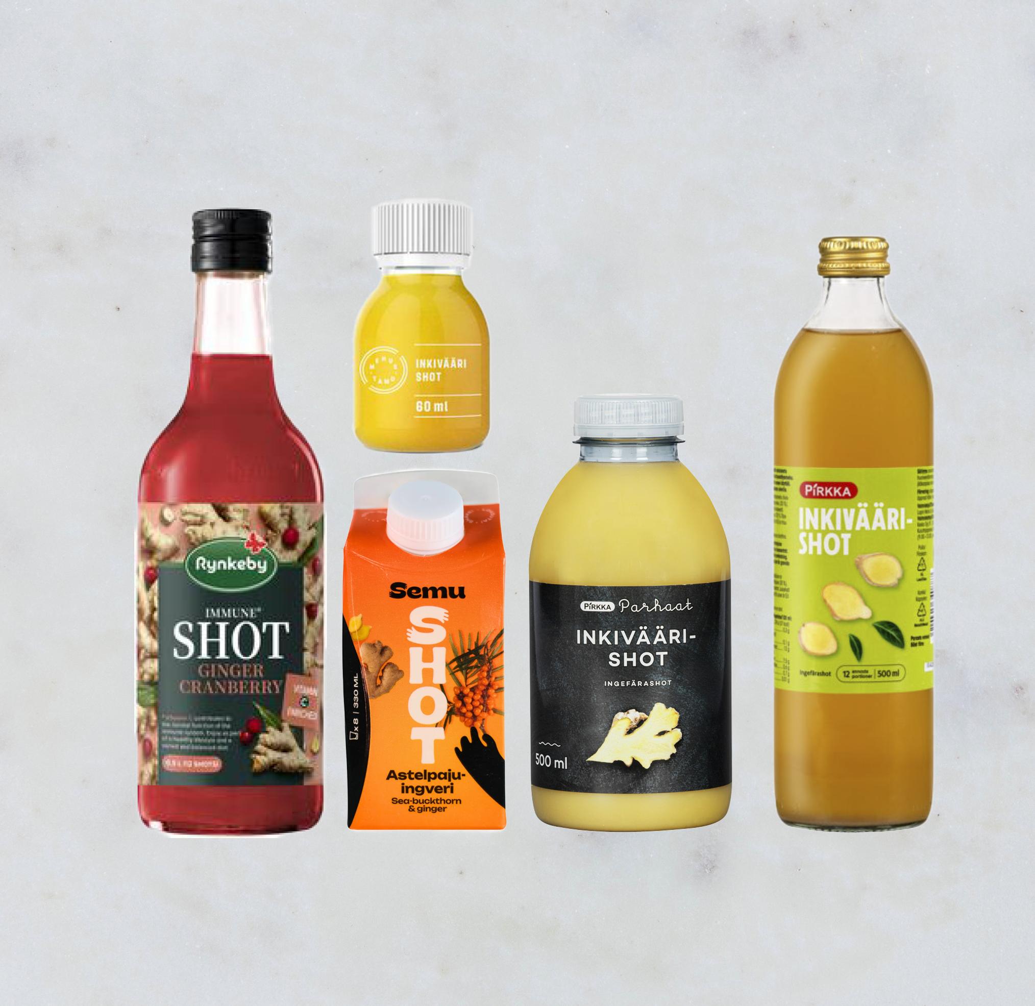 Ruokatoimituksemme maisteli viisi erilaista kaupan inkiväärishottia. Pisteytimme juomat asteikolla 1–5, ja maun lisäksi arvioimme pakkauksen käytännöllisyyttä. Voittajaksi kipusi tuhdisti inkivääriltä maistuva vaihtoehto, mutta testissä pärjäsivät myös shotit, joissa inkiväärin makupareina keikkuvat ananas, omena, karpalo ja tyrni – löydät voittajan jutun lopusta!