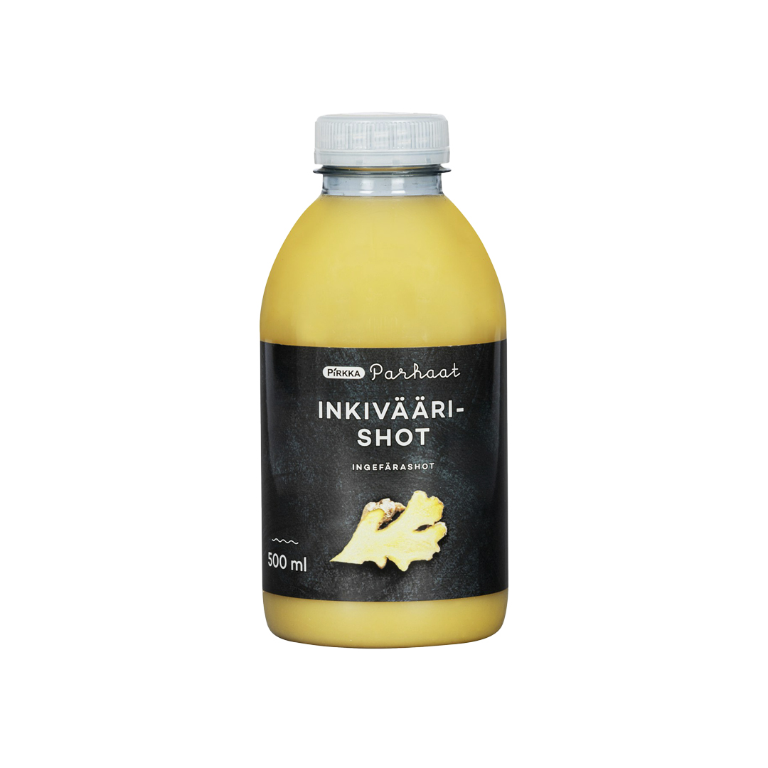 1. sija: Pirkka Parhaat inkiväärishot, 6,49 € / 500 ml, valmistus EU:ssa.
