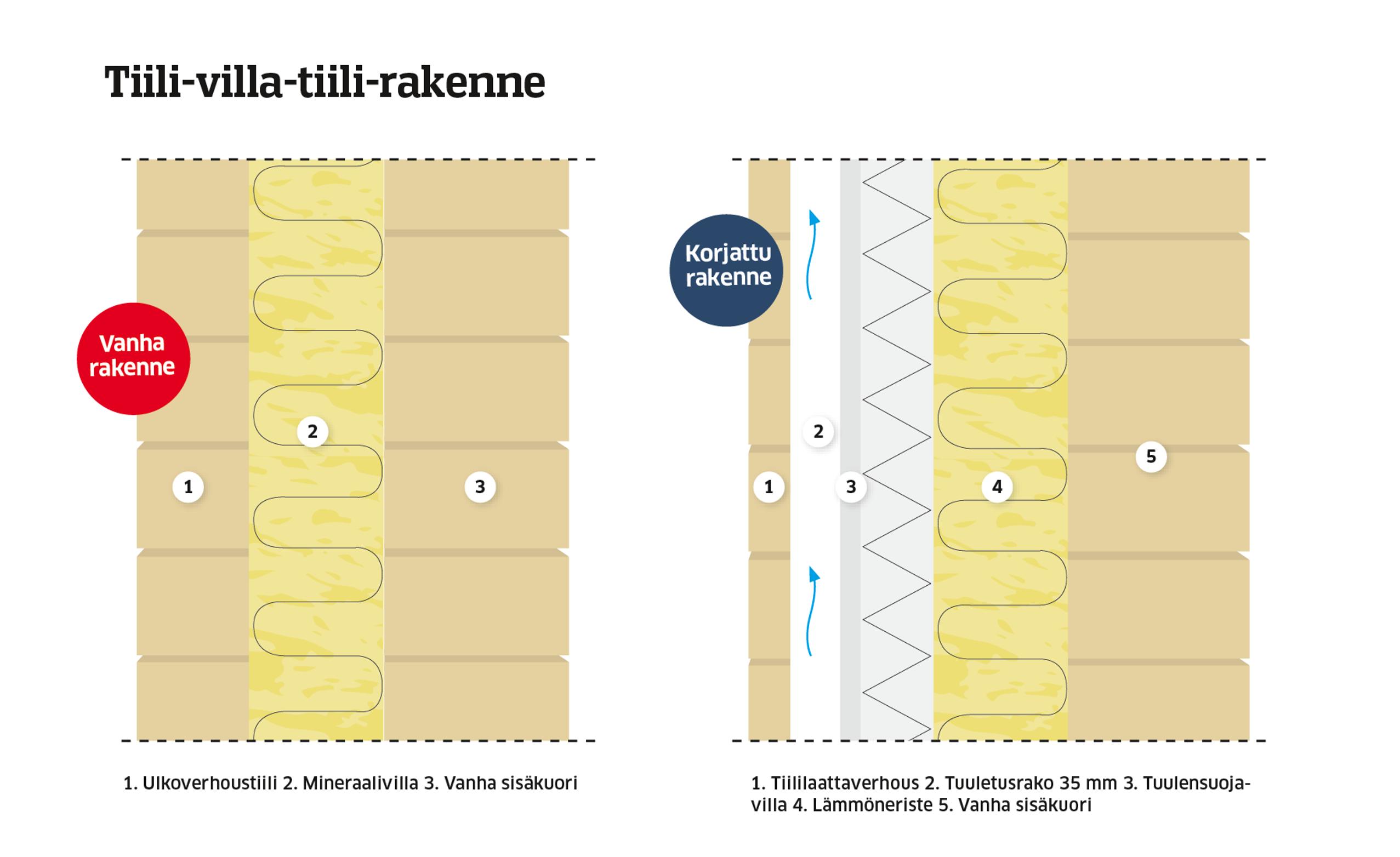 – Vaurioituneet eristevillat on poistettava ja korjaus tehtävä muutenkin pitkän kaavan mukaan. Jos talossa on lisäksi valesokkeli, on myös perustukset tavallisesti kuivatettava.