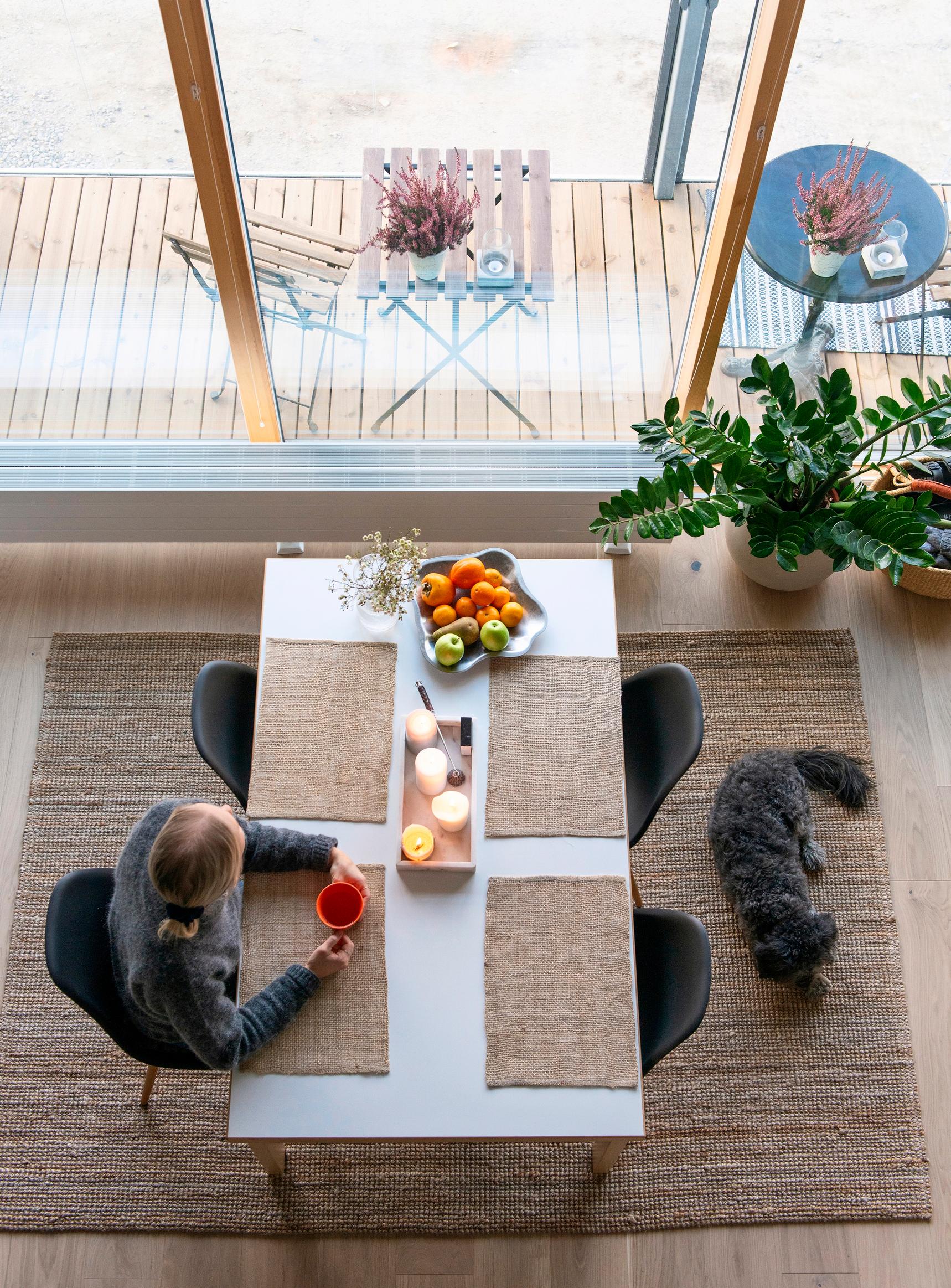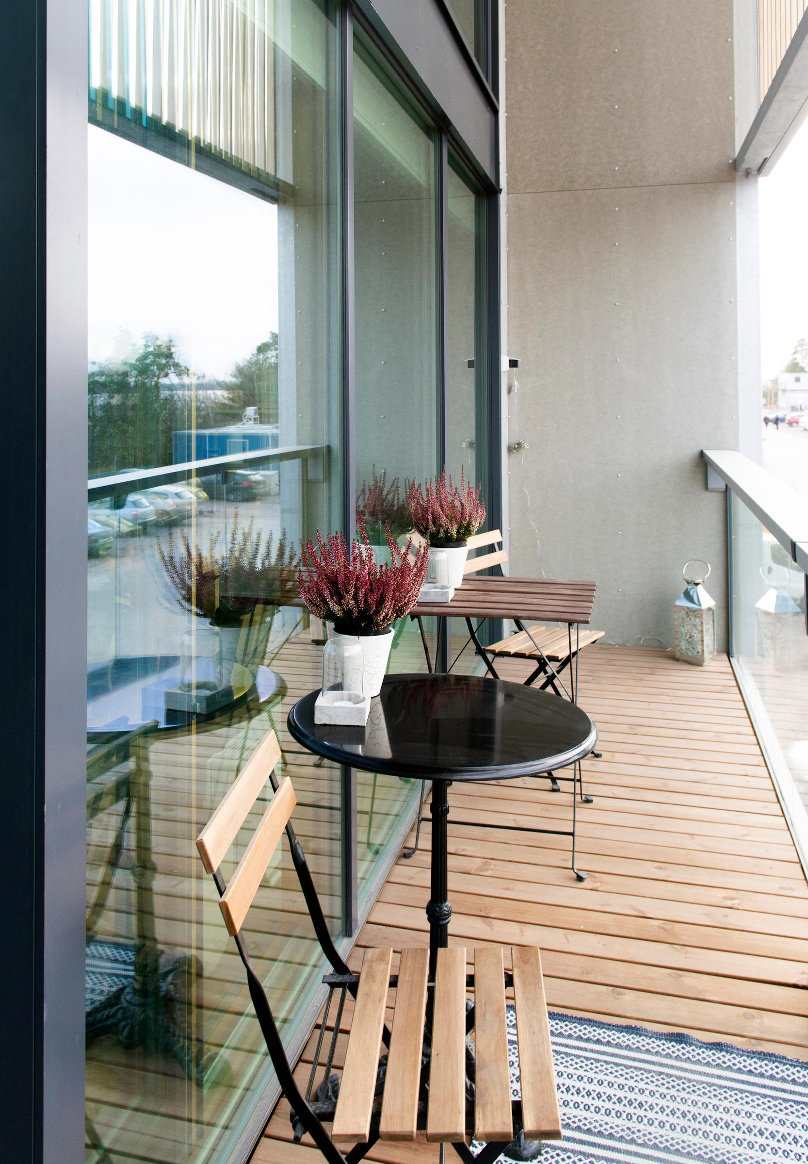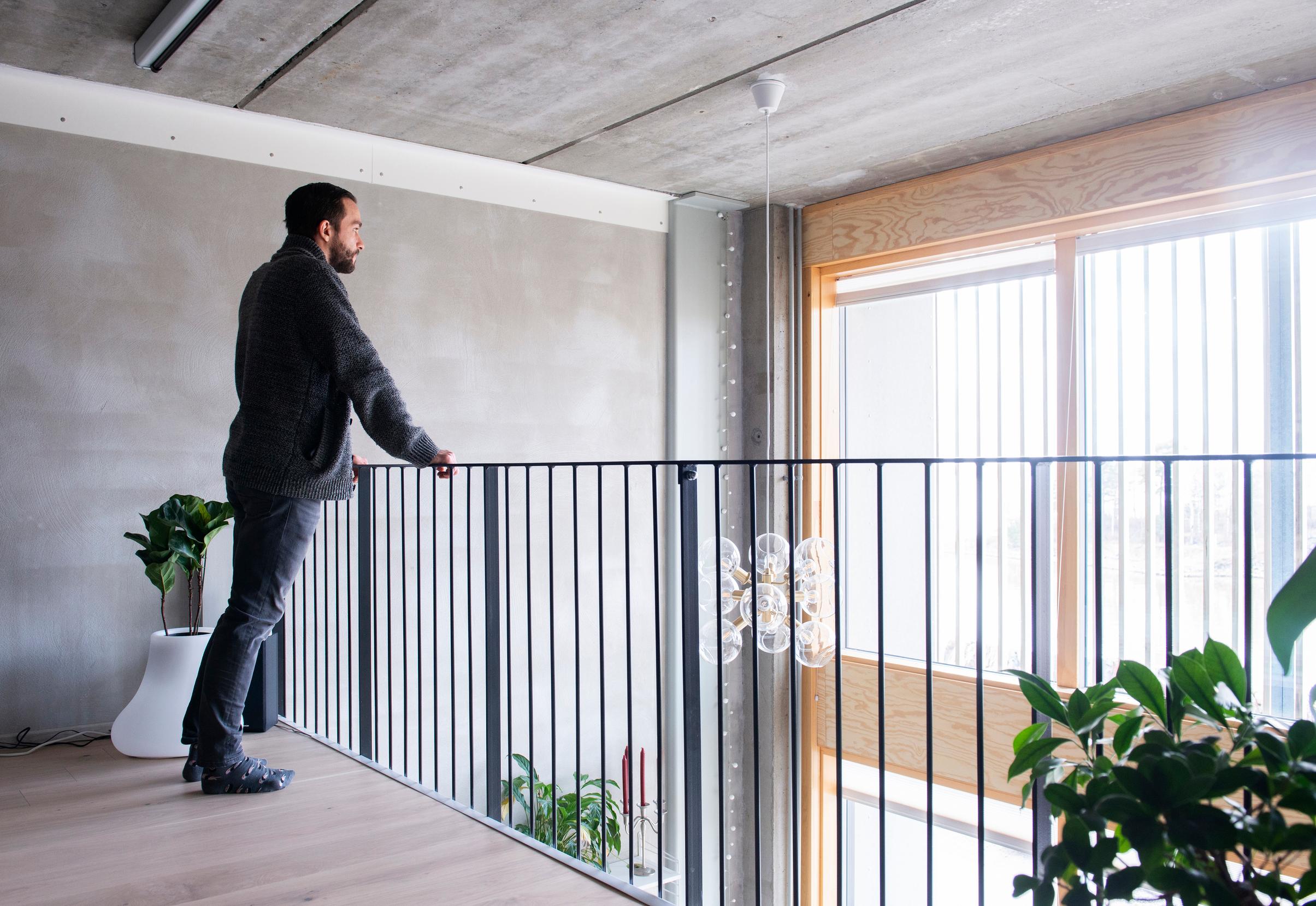 Kuluneena kesänä pari nautti aamukahvinsa luhtikäytävän auringossa. Loft-kodissa riittää valoa, vaikka päätyseinän valtavista ikkunoista paistaakin vain ilta-aurinko. Pariskunta on ollut positiivisesti yllättynyt Kruunuvuorenrannan kodin valoisuudesta, jopa harmaina talvipäivinä.