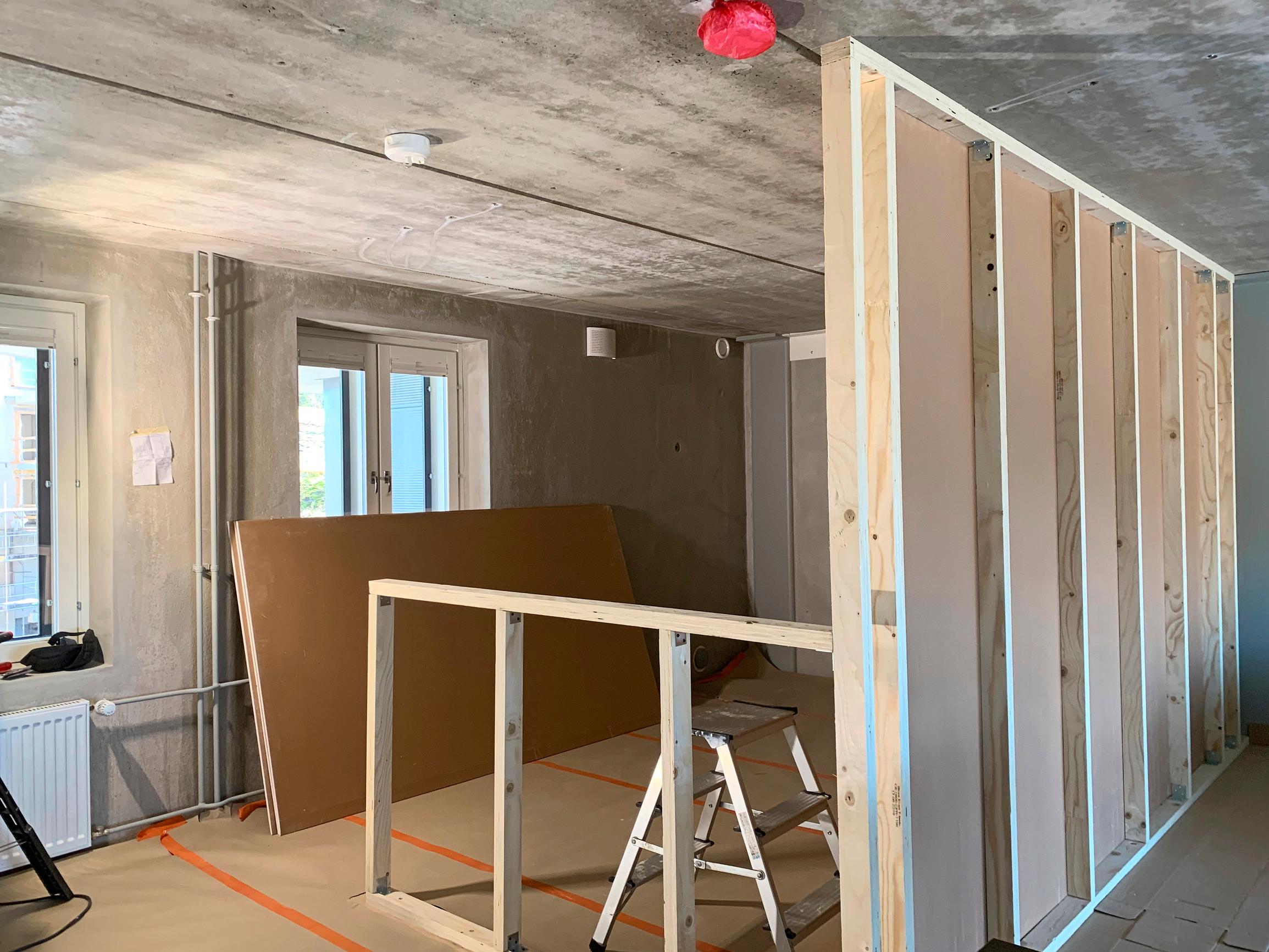 – Väliseinän koolaukset ovat puuta, ja sen sisällä on villat. Päälle laitettiin kipsilevyt, Markus kertoo.