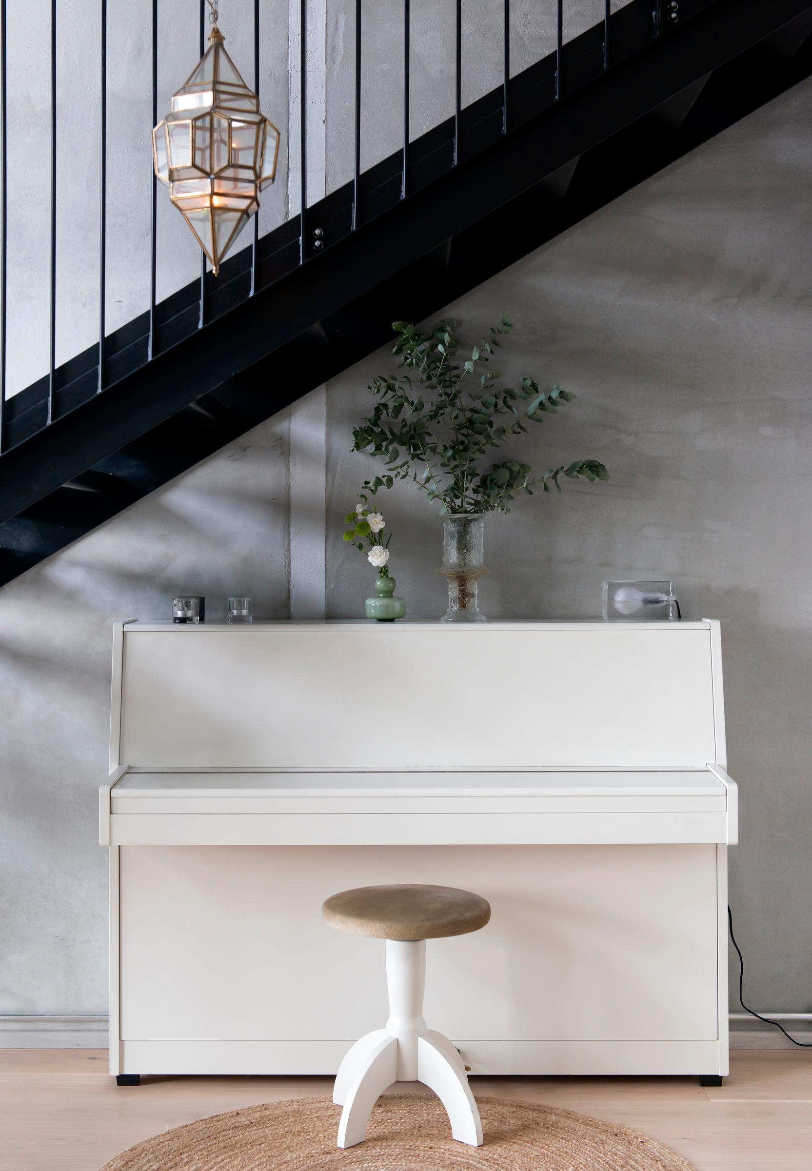 Luhtikäytävään johtavan alakerroksen eteisaula on avara. Tiina sommitteli portaiden alle leikkimielisesti pianoloungen. Hän sai vihdoin paikan vanhalle pianolleen, joka oli odottanut uutta kotia kymmenen vuotta vanhempien luona.