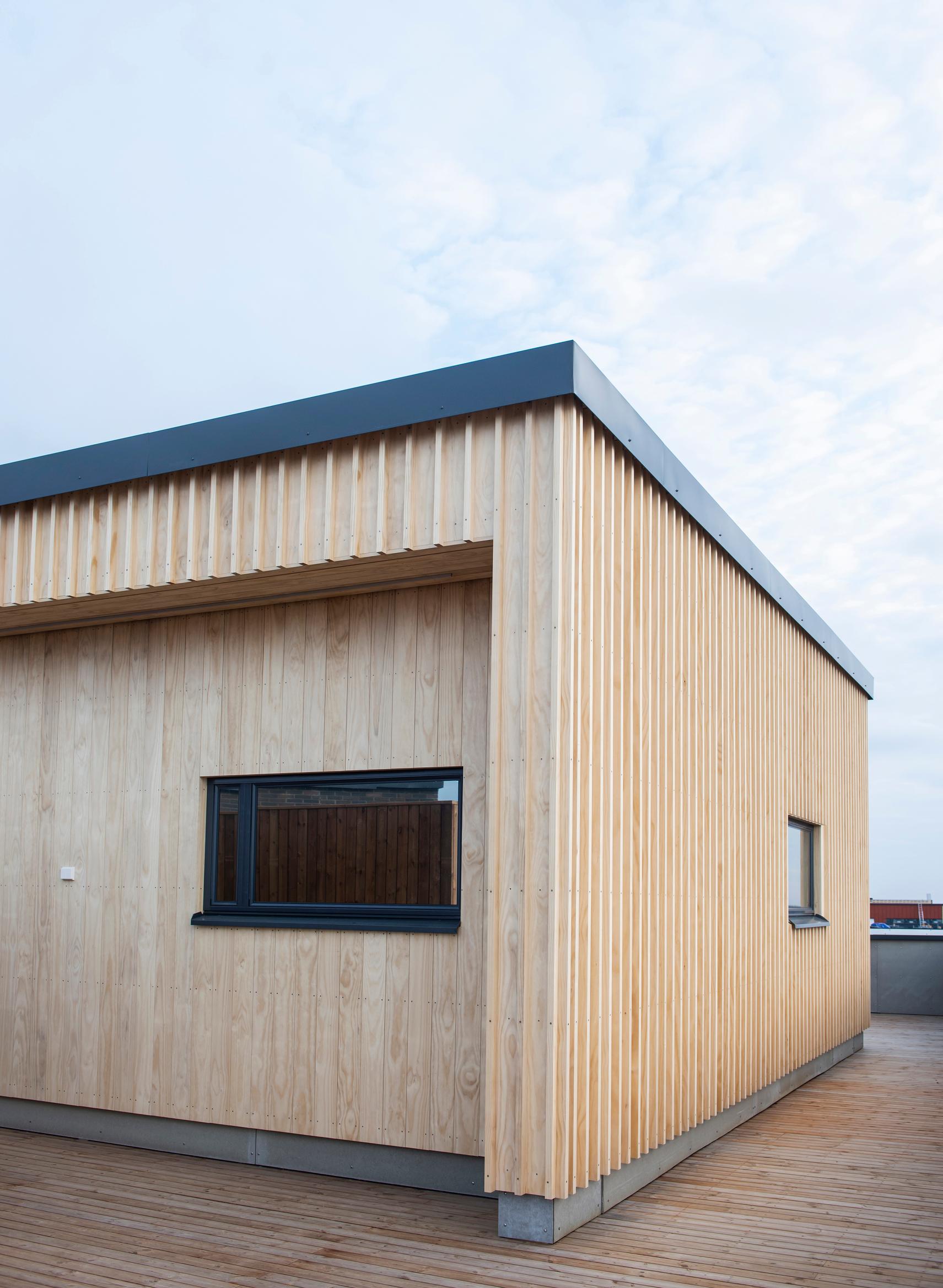 Makuuhuoneessa on pieni ikkuna talon luhtipuolelle, joka toimii myös määräysten mukaisena hätäpoistumistienä. Keittiön päällä olevaan olohuoneeseen puolestaan tulvii valoa päätyseinän korkeista ikkunoista.
