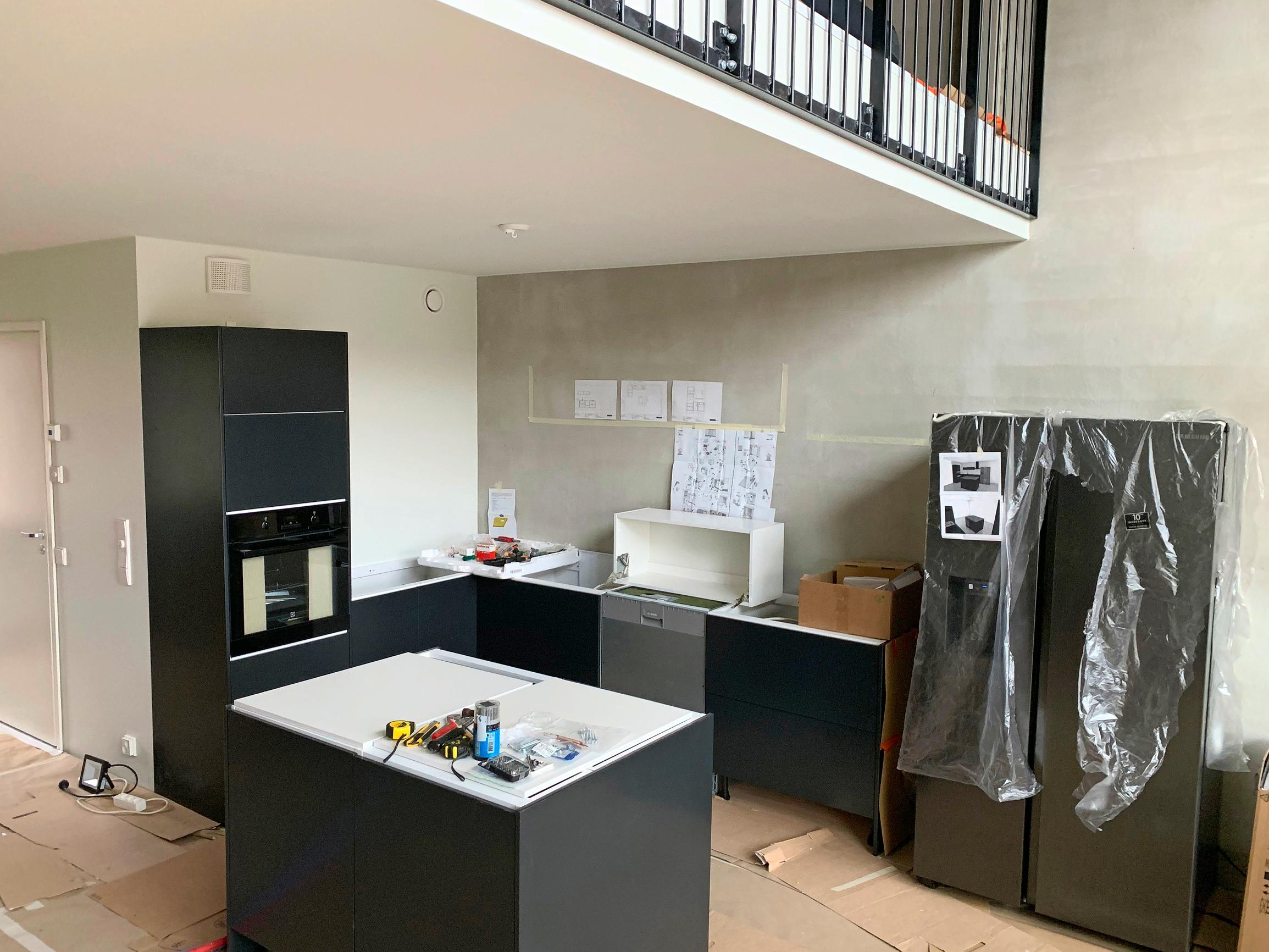 Kun asunto luovutettiin asukkaalle, siirtyi myös vastuu konkreettisesta työstä heille. Raakatilan suunnittelu alkoi keittiöstä, jonka paikka oli lukittu projektin alussa. Ensimmäinen uuteen kotiin hankittu asia olikin keittiöhana, joka odotti kiltisti asennusta omalle paikalleen Tiinan ja Markuksen edeltävän kodin kirjahyllyssä Punavuoressa.