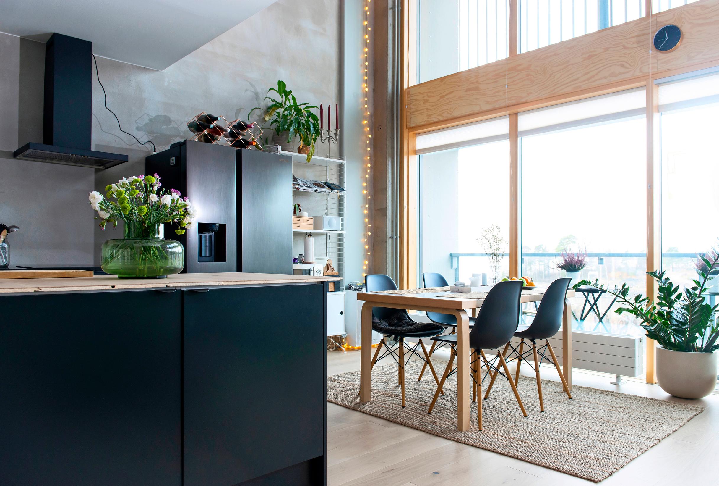 Pari halusi tumman keittiön, sillä se tuntui hyvältä kontrastilta valon täyttämään tilaan. Lattiamateriaalin valinta oli sen sijaan vaikeampaa. Pitkän pohdinnan jälkeen Tiina ja Markus valitsivat valkolakatun tammiparketin, jolla päällystettiin myös keittiön saarekkeen taso.