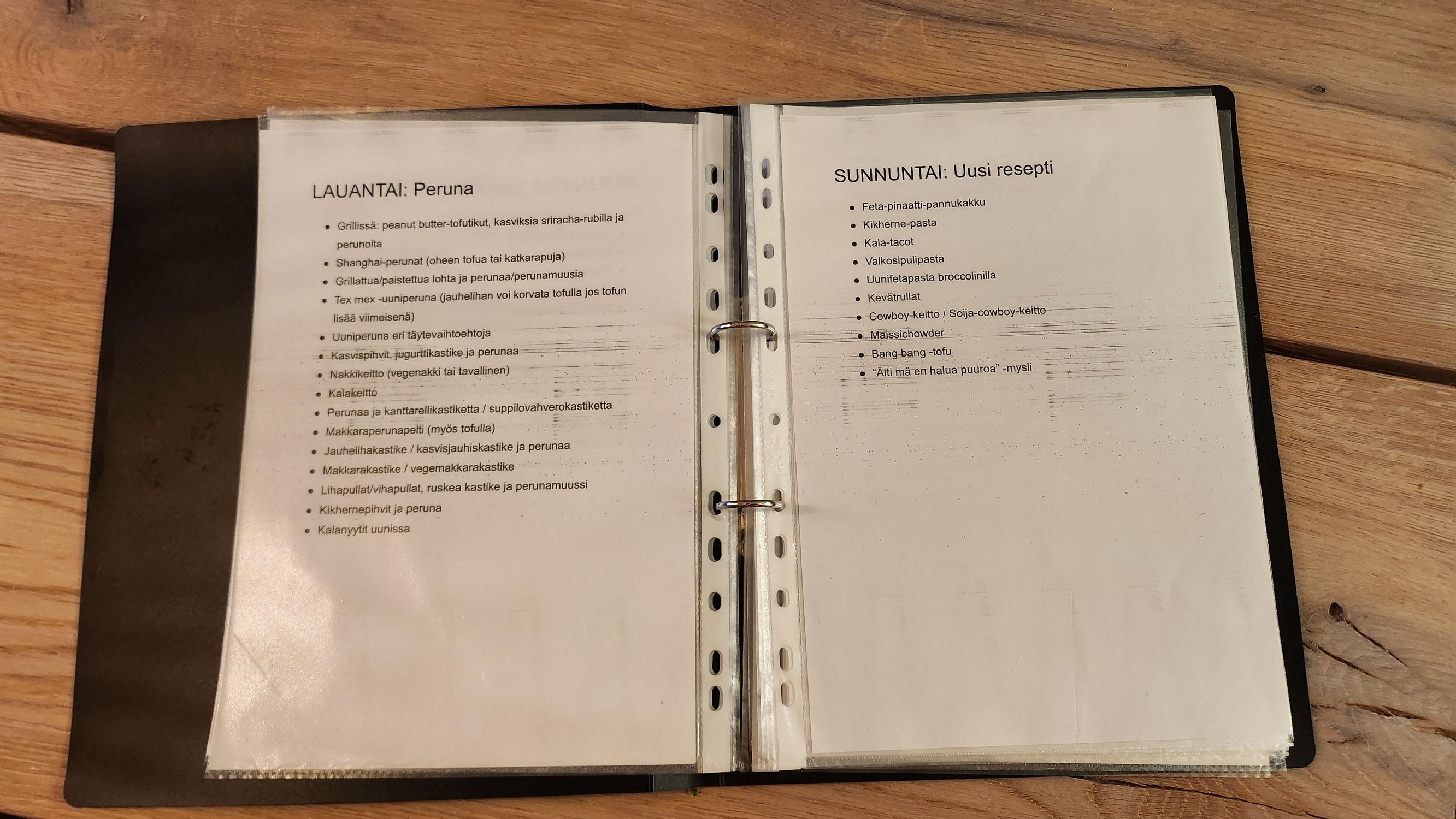 Näin vastaavan toteutuksen ohimennen erään amerikkalaisen äidin tekemällä videolla. Ajattelin, että tämä olisi näppärä tehdä itsellekin! Kokosin vakituiset reseptimme kansioon ja julkaisin sen somessani @organisoituarkikaaos. Kysyin myös seuraajiltani vinkkejä parhaisiin resepteihin.