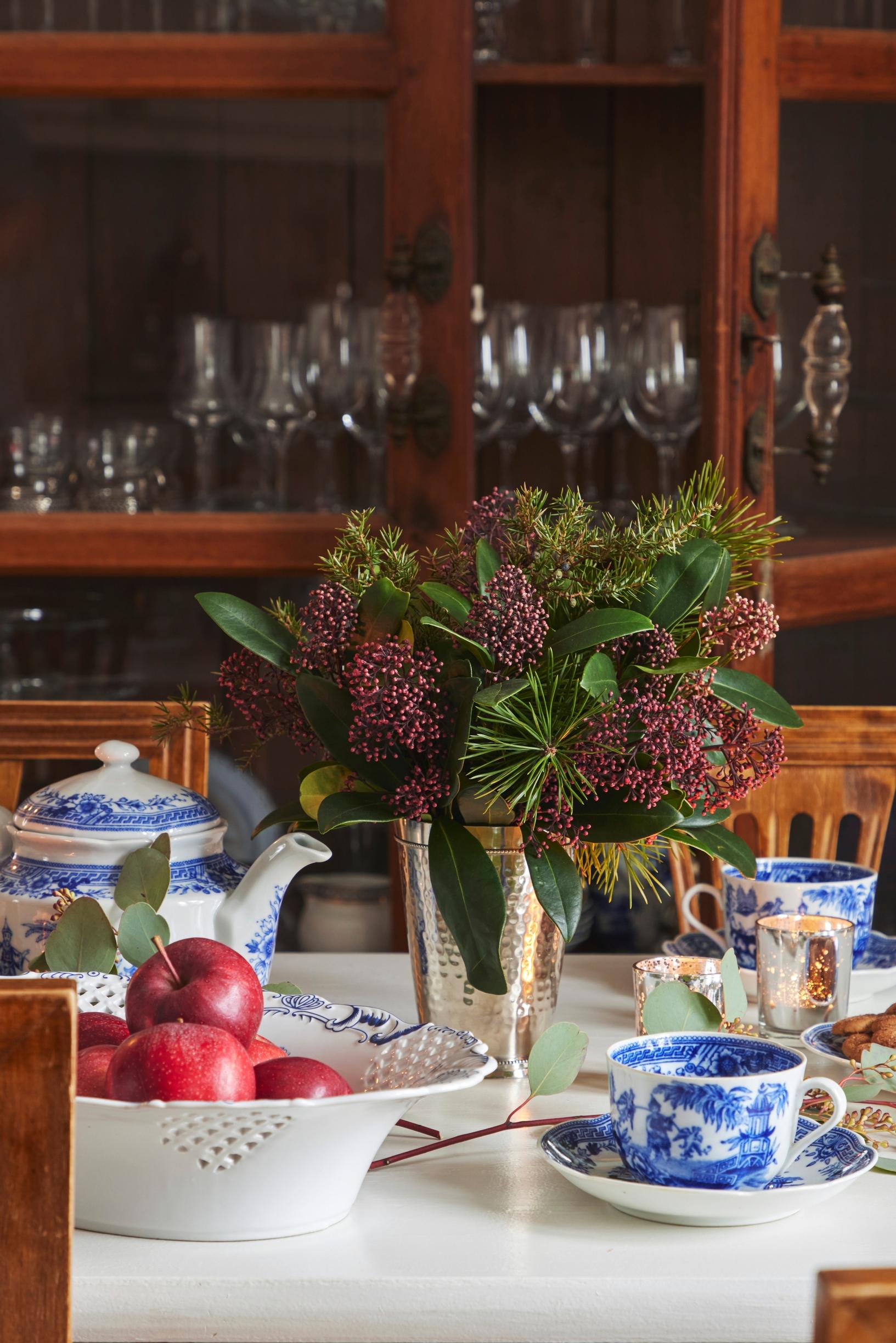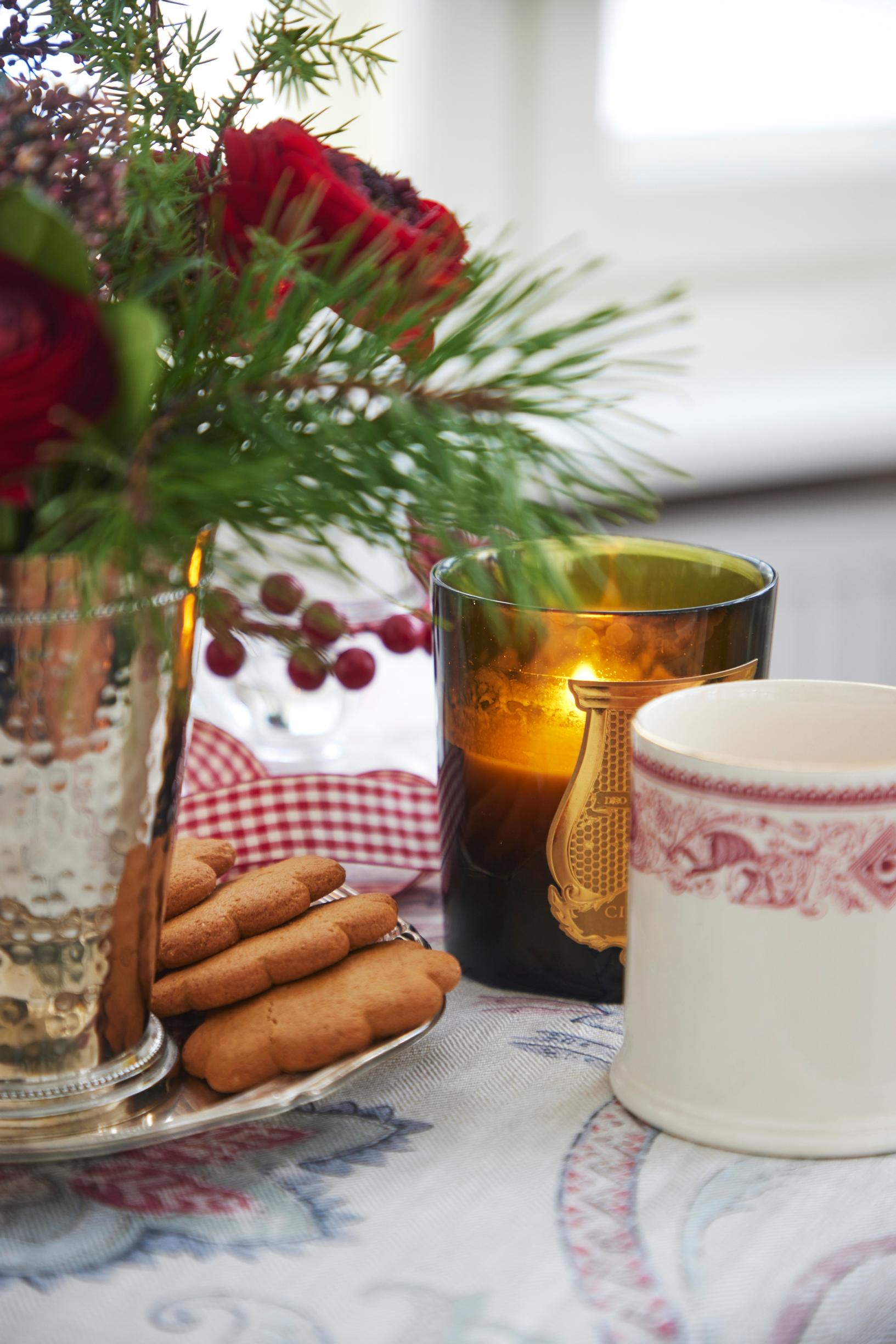 Joulukukkina Elina suosii vanhanajan brittiläisiä suosikkeja kuten perunanarsisseja, tasetteja ja neilikoita. Ruokapöydän keskellä maljakossa yllättävät valkoiset syreeninoksat, toisessa skimmiat ja voimakkaan punaiset ruusut.