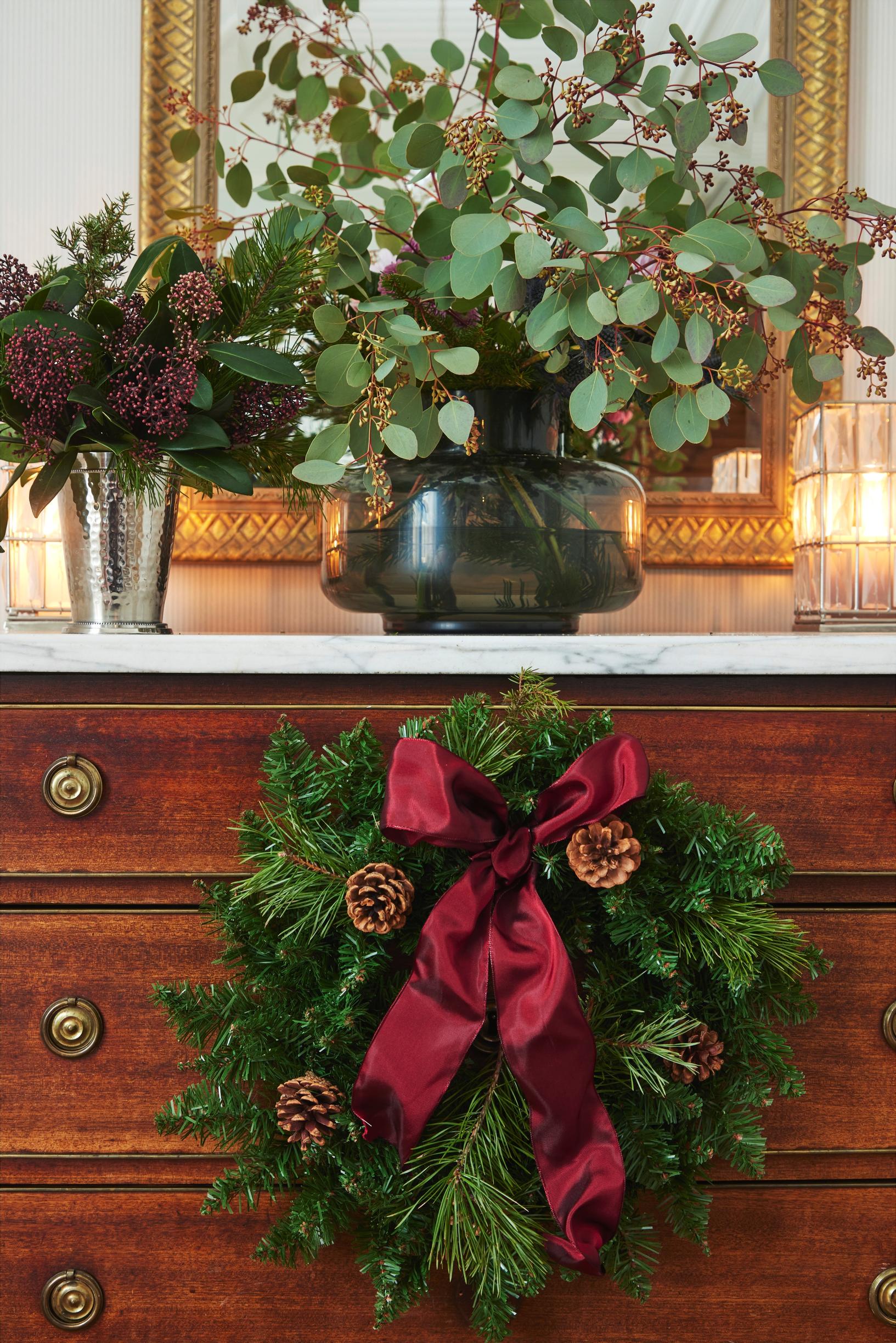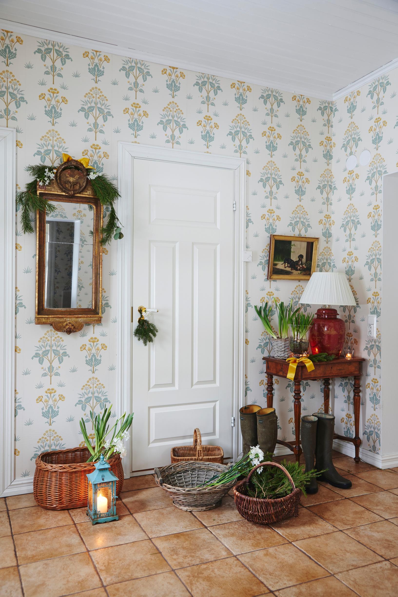 Tähän vaaleaan, klassisin kalustein sisustettuun kotiin Elina on tuonut koreittain punaista ja vihreää, ei kuitenkaan vain koristeina vaan kukkien ja havujen muodossa. Hän on ripustanut havuja ja eukalyptuksen oksia niin yläkertaan johtavan portaikon kaiteeseen, eteisen peiliin kuin kukka-asetelmiin.