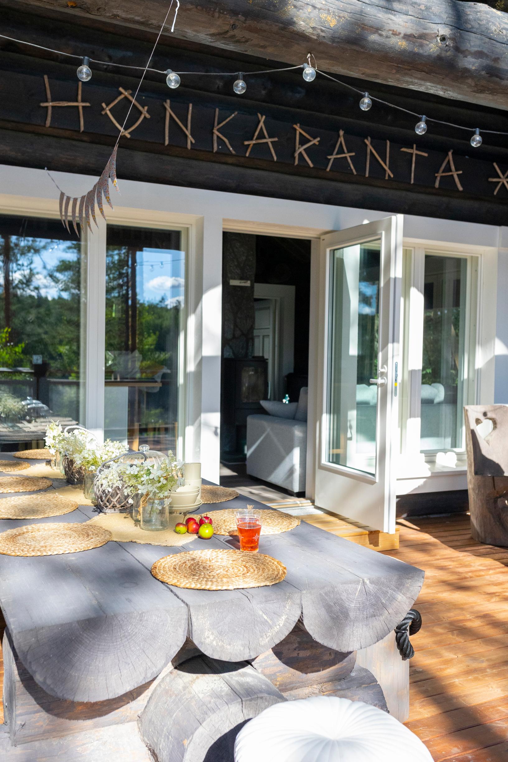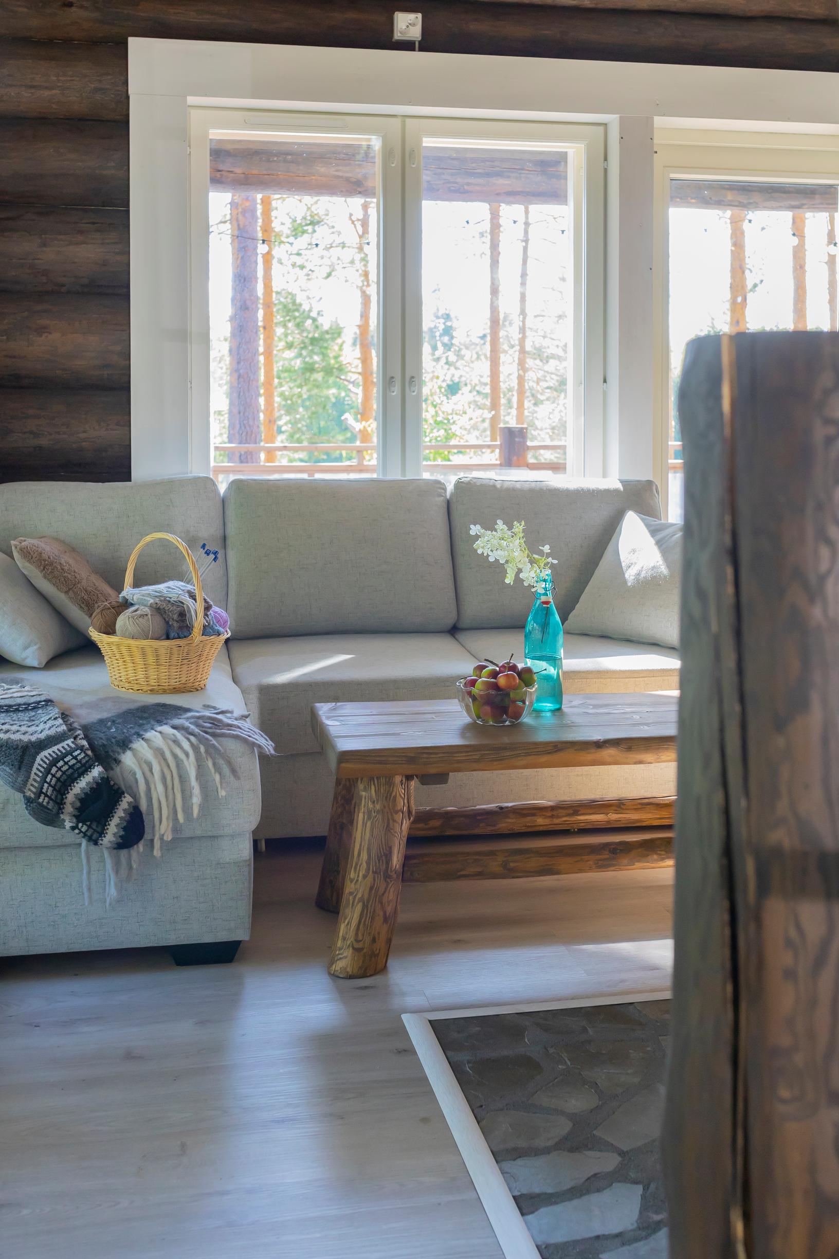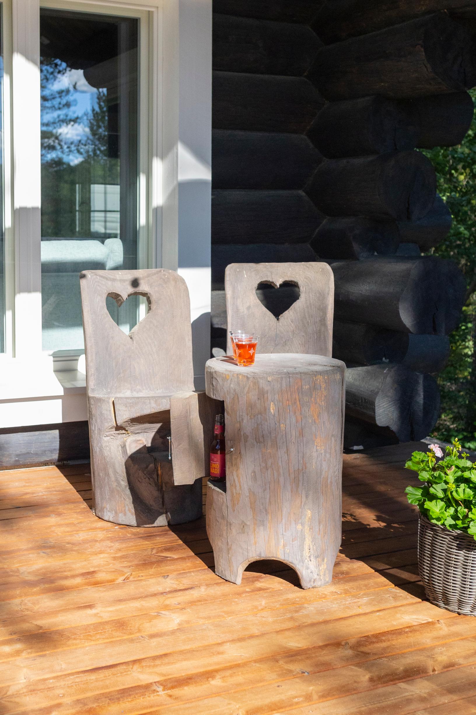 Timo on tehnyt mökkiin itse myös huonekaluja. Näkyvimmällä paikalla ovat jykevä oleskelutilan pöytä ja jyhkeät terassikalusteet, jotka hän on valmistanut oman tontin puista.