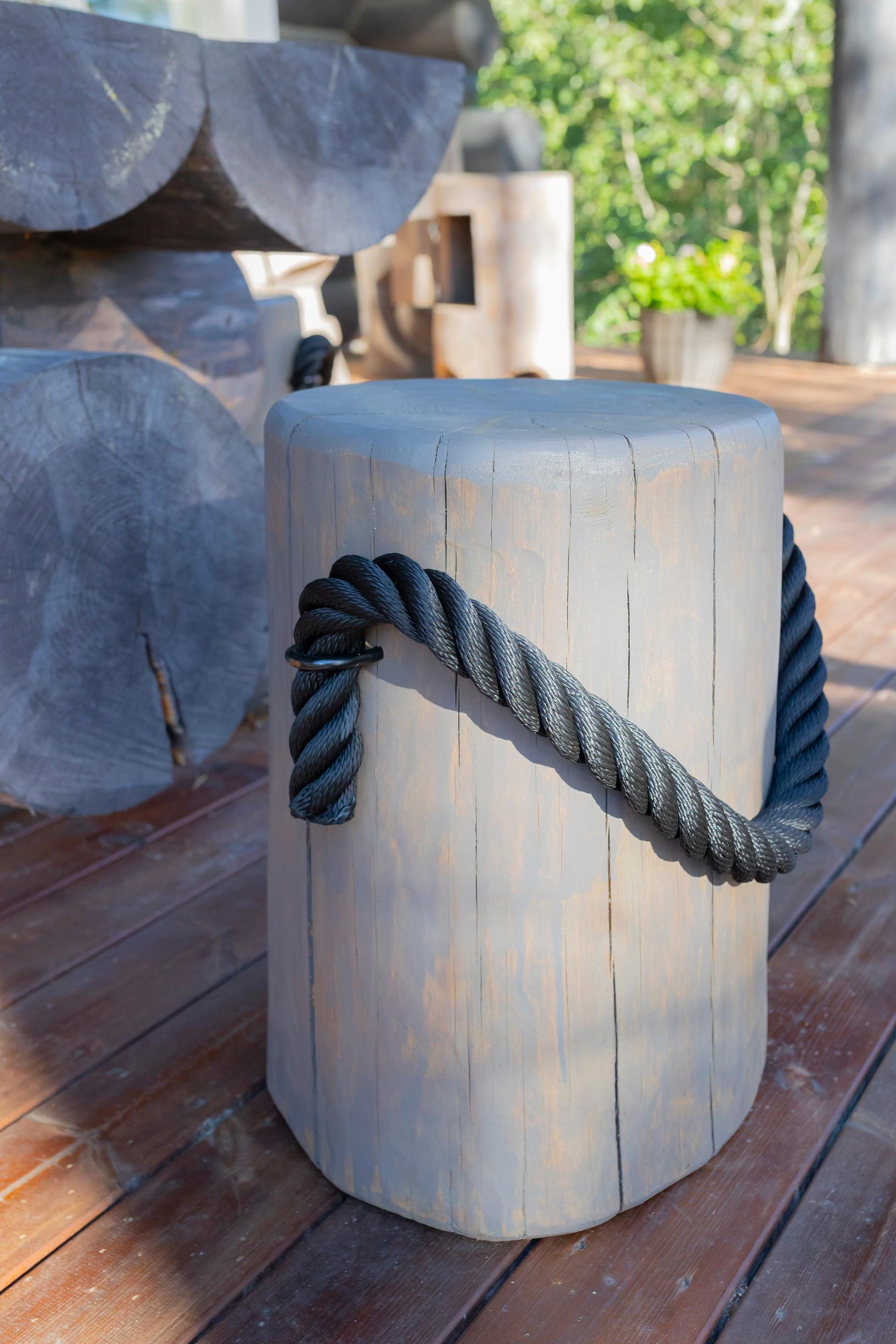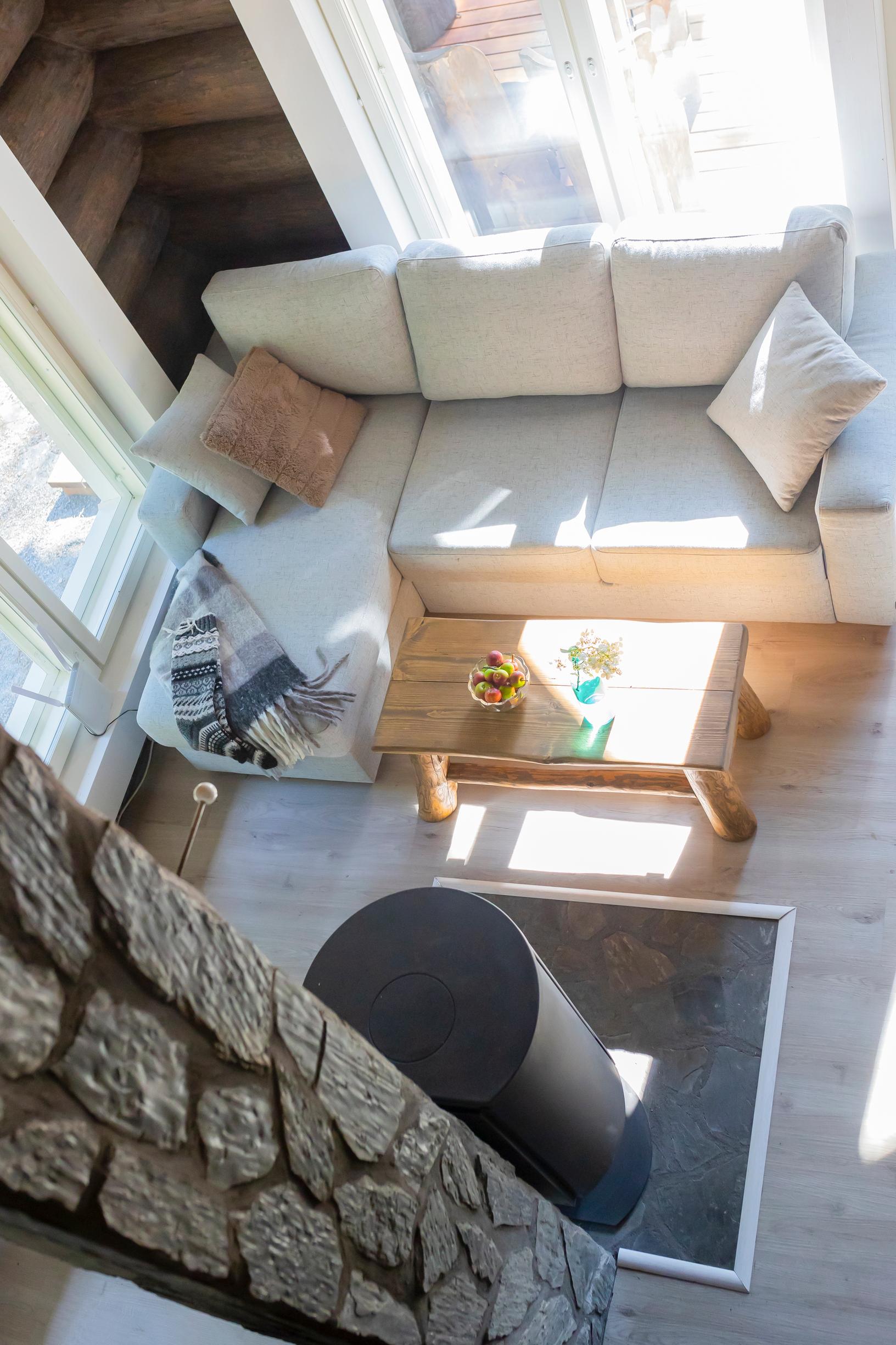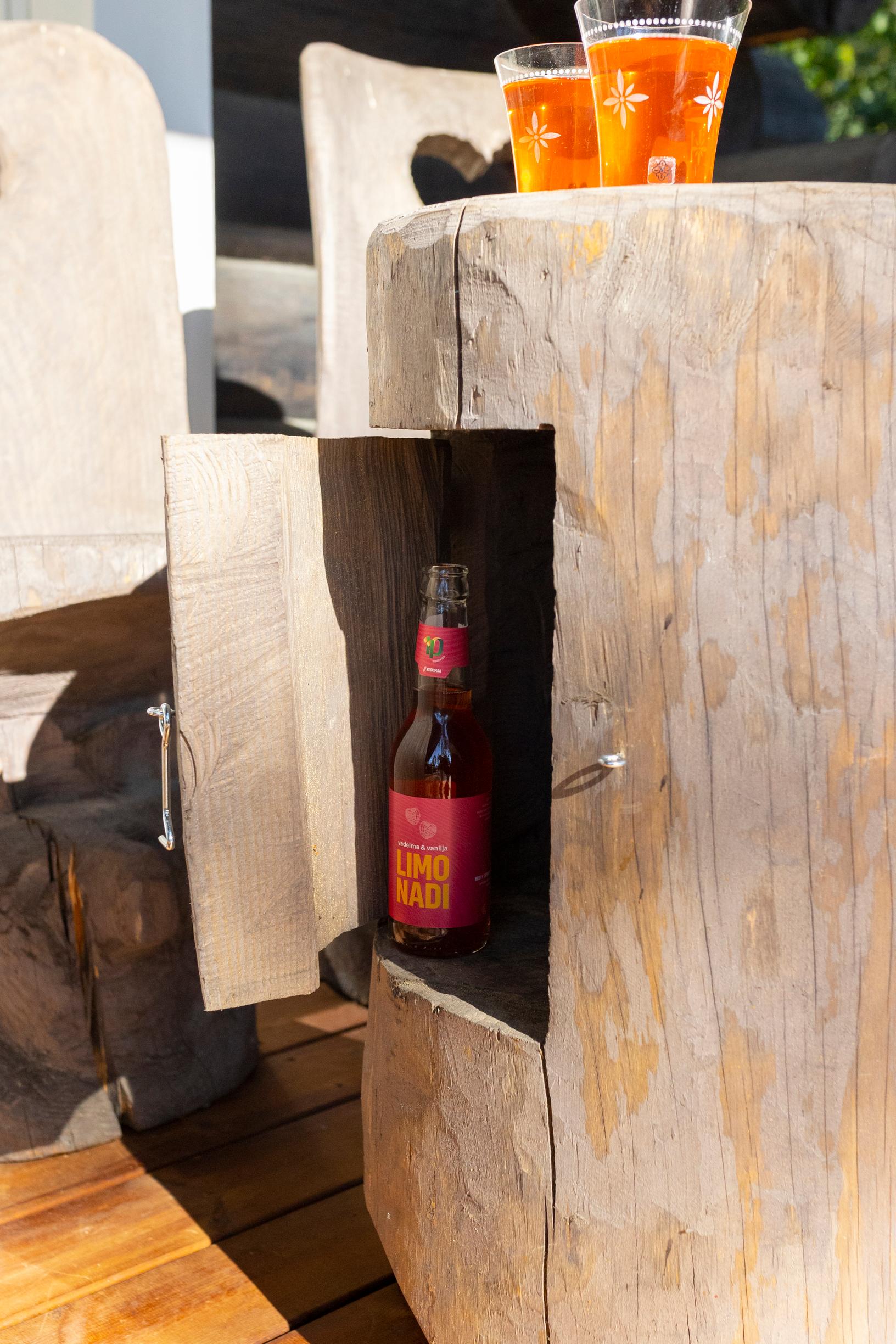 Timo on tehnyt mökkiin itse myös huonekaluja. Näkyvimmällä paikalla ovat jykevä oleskelutilan pöytä ja jyhkeät terassikalusteet, jotka hän on valmistanut oman tontin puista.