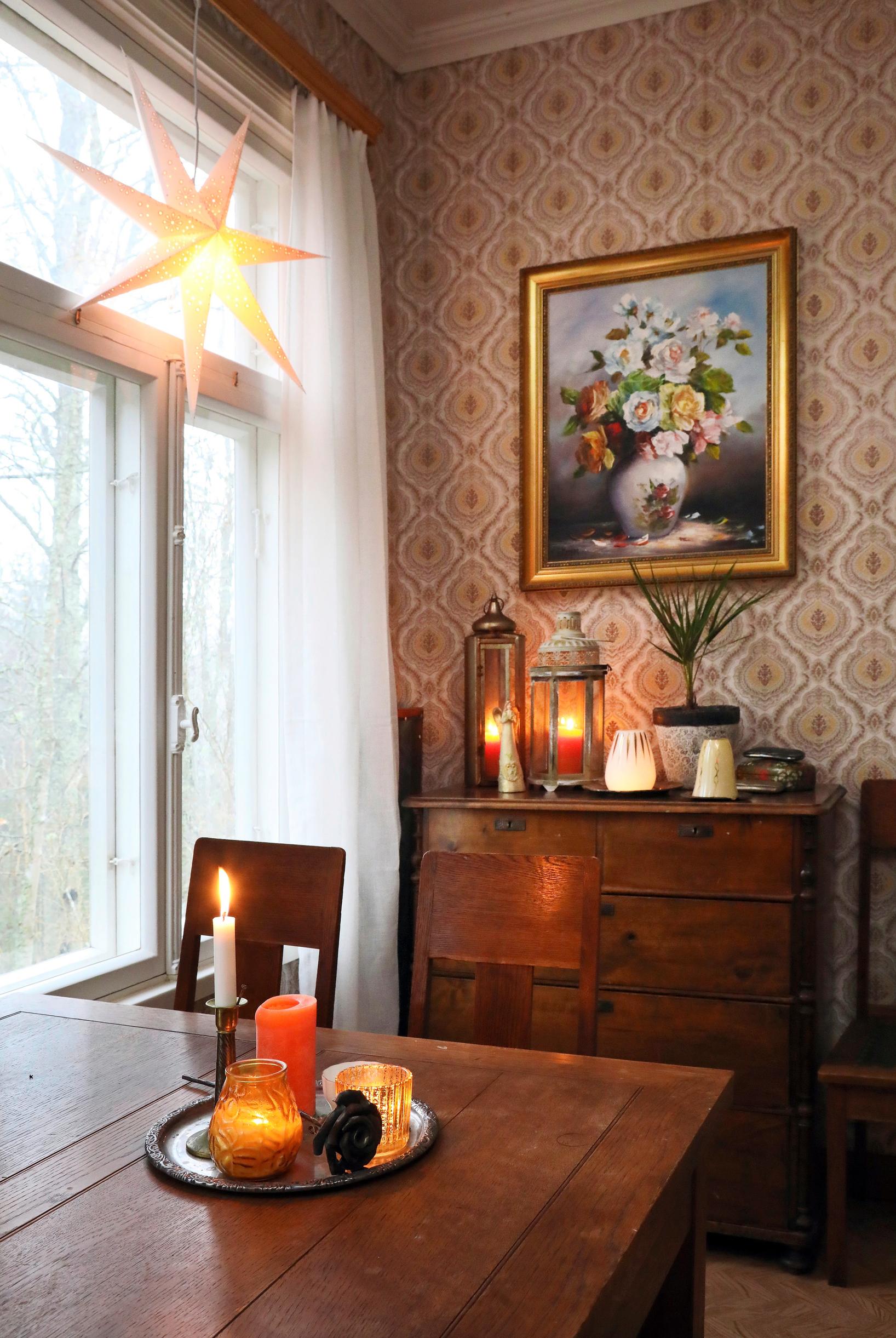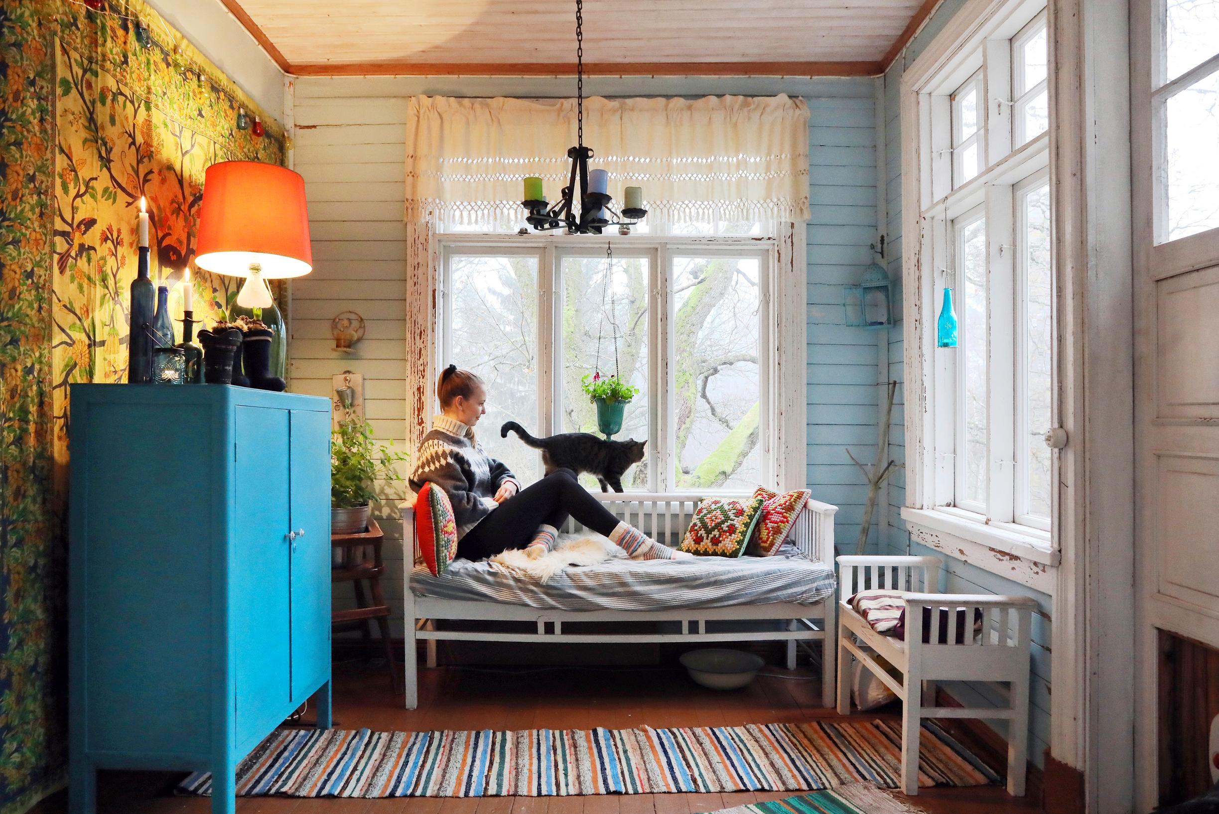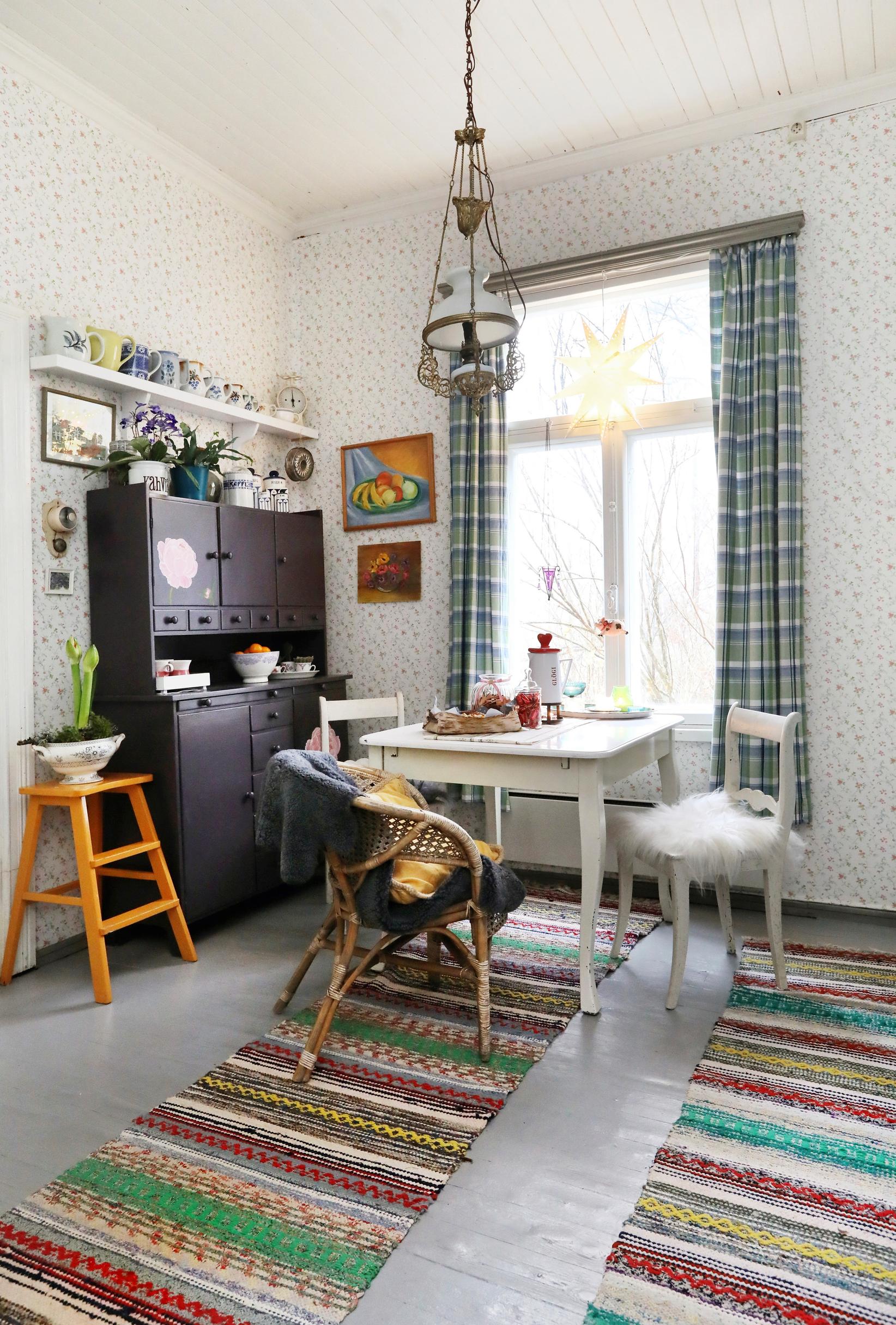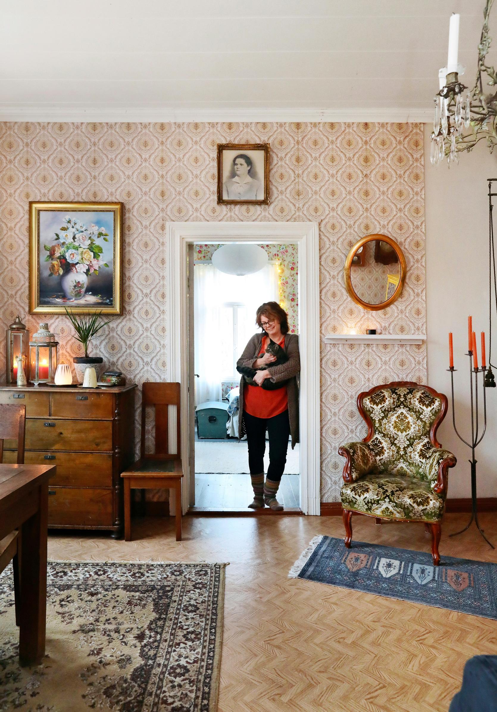 – Tärkeintä on, että sisustus miellyttää omaa silmää. Kotona pitää olla väriä, sillä iloinen sekamelska on kodikasta. Talo on ohjannut sisustustyyliäni kohti rappioromantiikkaa: tänne sopivat parhaiten vanhat, hieman kuluneet huonekalut ja täyteläiset värit.